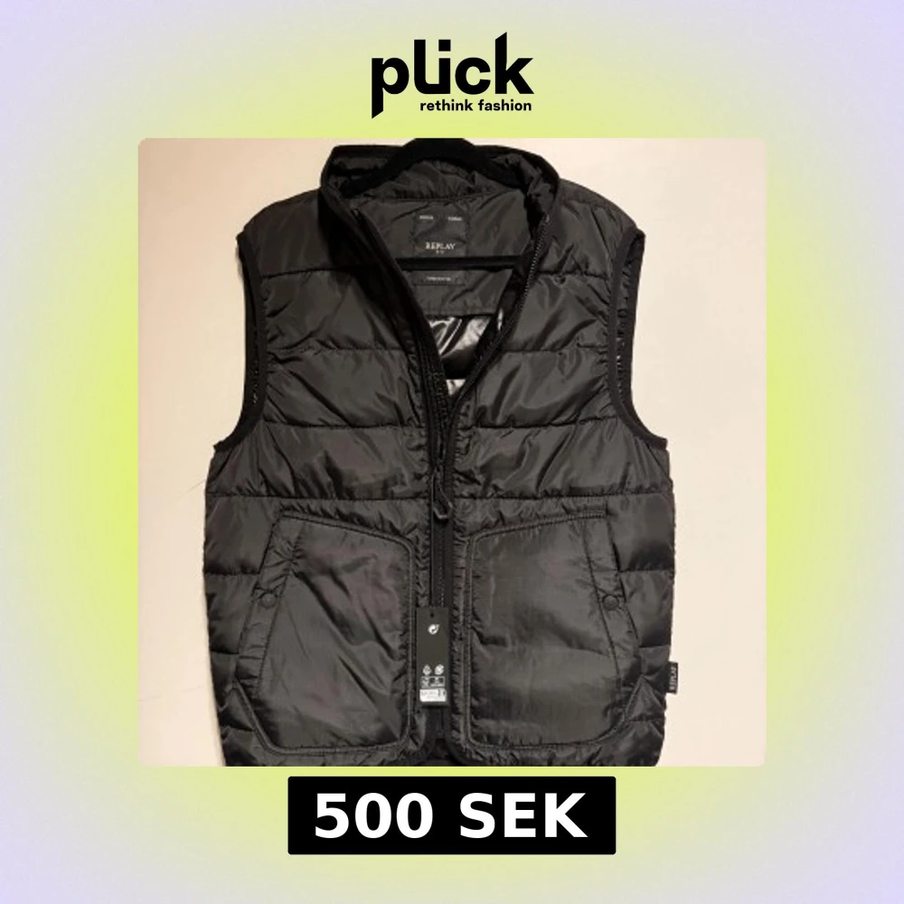 Svart dunväst från Replay med quiltad design och två stora fickor framtill. Västen har hög krage och dragkedja hela vägen upp. Materialet är glansigt och känns lätt, perfekt för lager-på-lager. Snygg och enkel att matcha med hoodies eller tröjor.