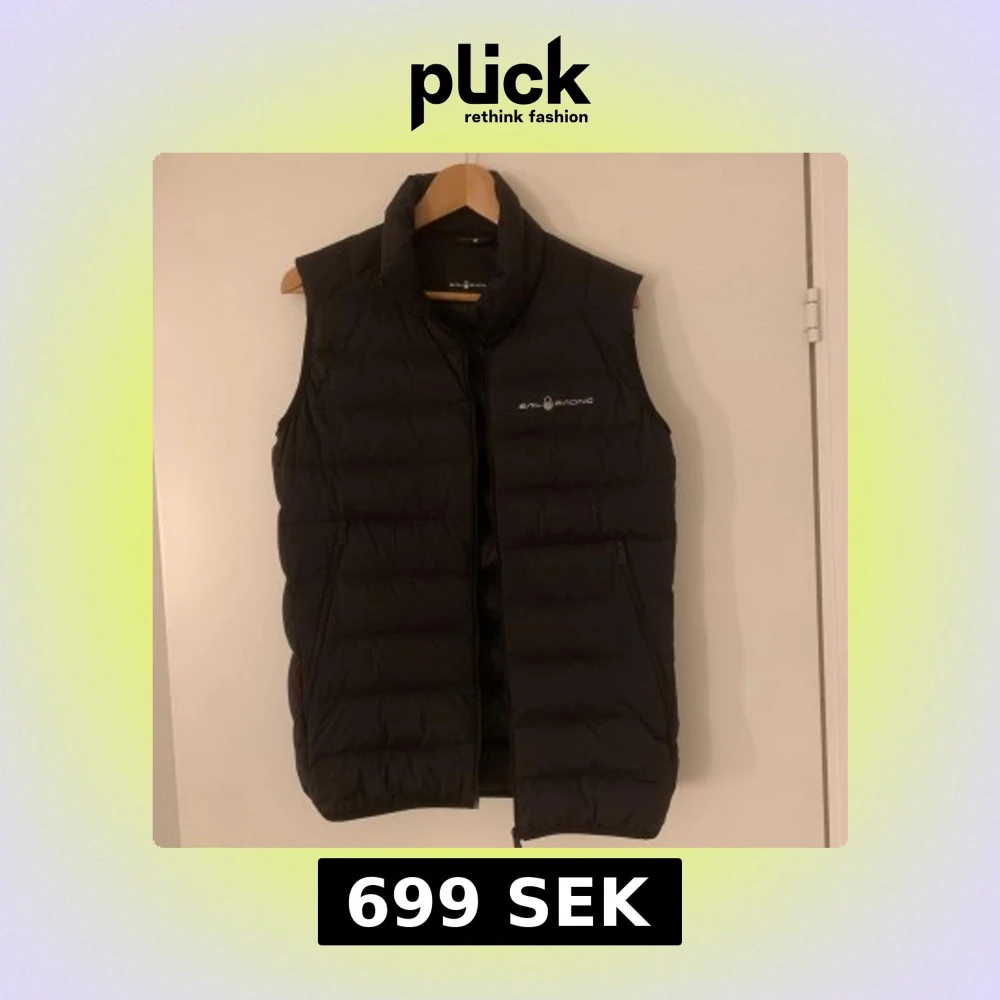 Säljer en svart dunväst från Sail Racing med hög krage och diskret logga på bröstet. Västen har två dragkedjefickor på sidorna och quiltad design. Perfekt att slänga över en hoodie eller tröja när det är kyligt ute.(Passar både S och M)