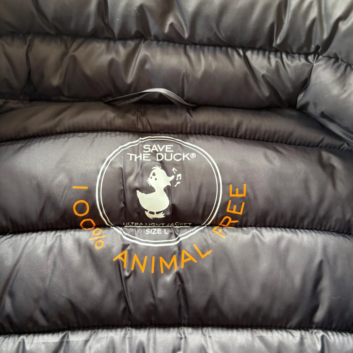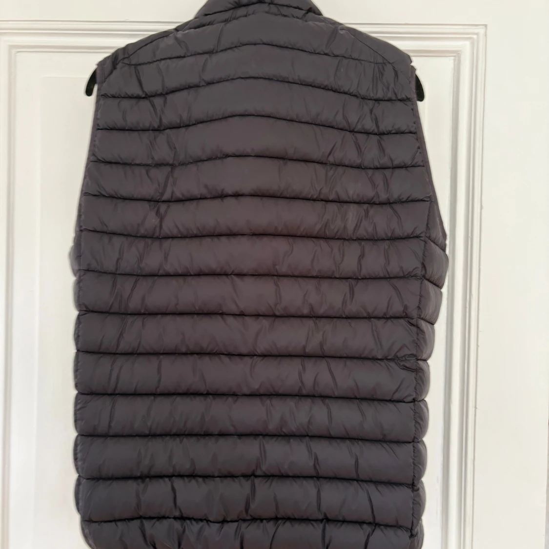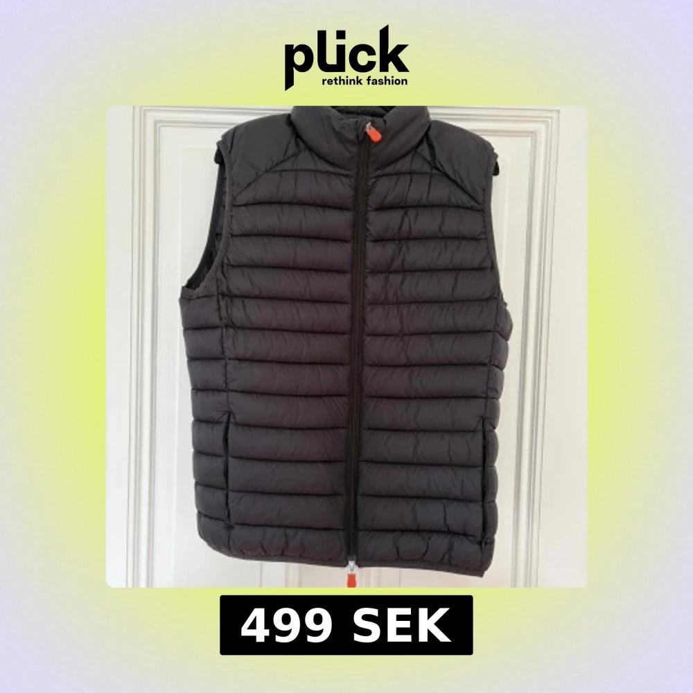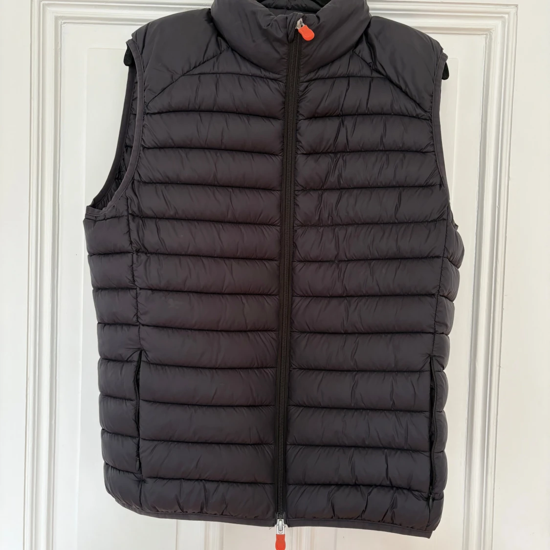Säljer en svart dunväst från Save The Duck i storlek L. Använt 1 gång. Västen är quiltad med horisontella sömmar, har hög krage och hel dragkedja med orange detaljer.