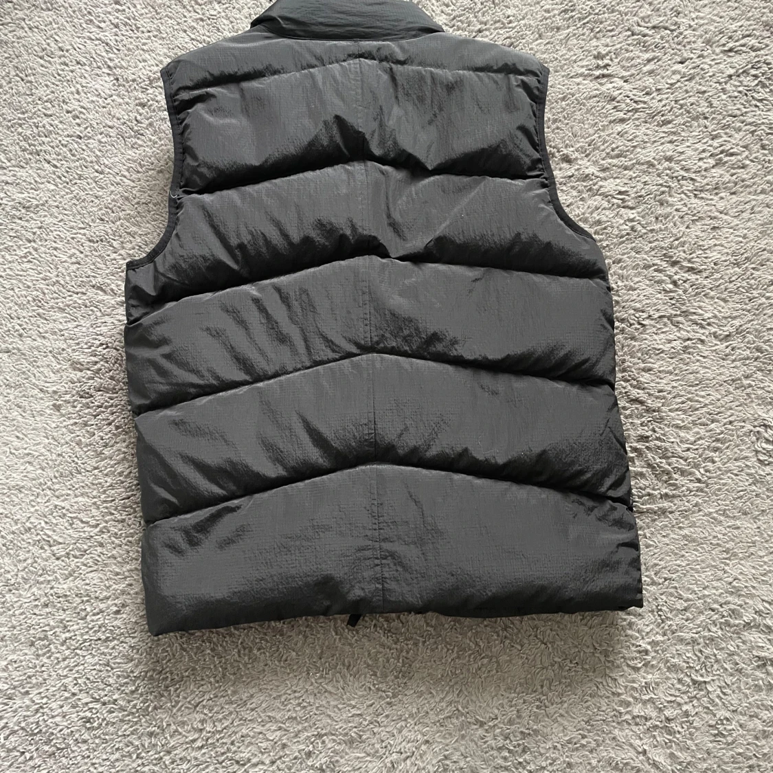 Säljer en svart dunväst från Stone Island med hög krage och knappar framtill. En dragkedja finns även under knapparna. Västen har två stora fickor på framsidan och klassisk Stone Island-logga på bröstet. Perfekt för lager-på-lager under kyliga dagar. Använd ett fåtal gånger och är i ett super skick. (Äkta)