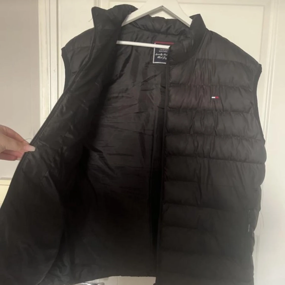 Snygg svart dunväst från Tommy Hilfiger med dragkedja och diskret logga på bröstet. Perfekt för kyligare dagar och enkel att matcha med andra plagg.