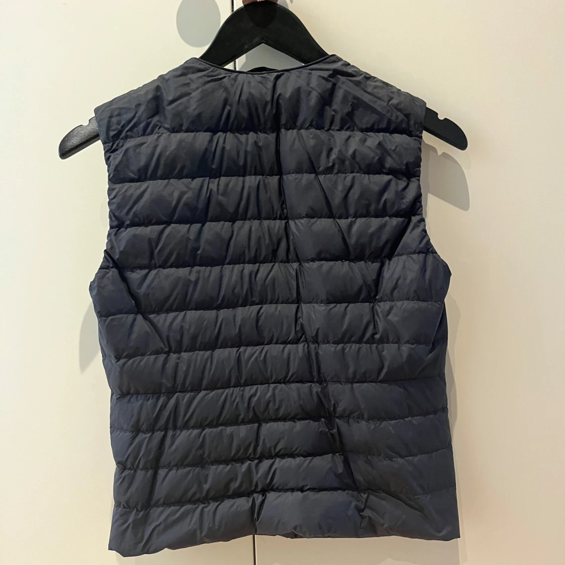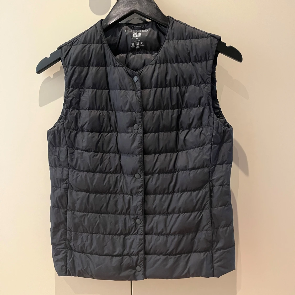 Säljer en svart, quiltad dunväst från Uniqlo. Västen är lätt och har tryckknappar framtill samt rund halsringning. Perfekt att slänga över en hoodie eller tröja när det är kyligt ute. Klassisk och stilren design som funkar till det mesta.