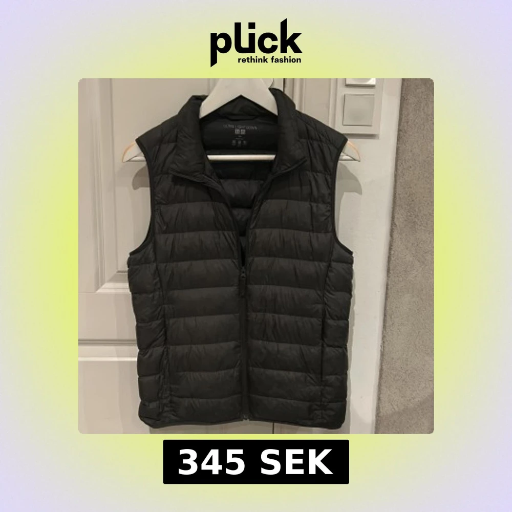 Säljer en svart, ultralätt dunväst från Uniqlo i storlek XXS. Västen är quiltad med horisontella sömmar, har dragkedja framtill och hög krage. Perfekt att packa ner i medföljande påse när du är på språng. Skick 9/10✅