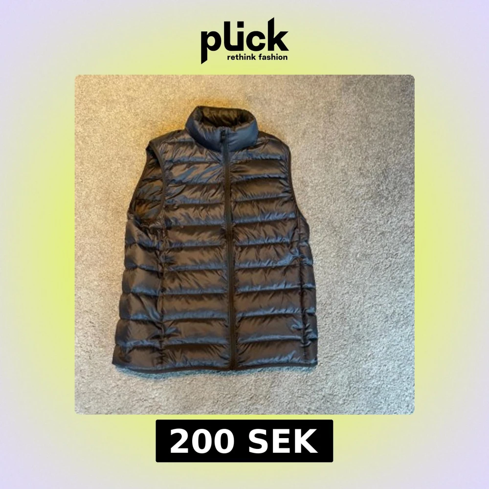 Säljer en svart dunväst från Uniqlo i storlek XS. Västen har quiltad design, hög krage och dragkedja framtill. Perfekt för lager-på-lager och lätt att bära tack vare sitt tunna och smidiga material.
