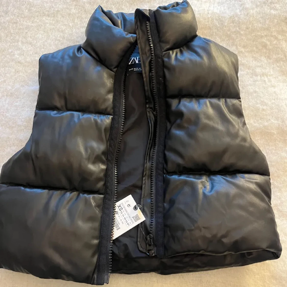 Snygg svart dunväst från Zara med dragkedja framtill. Perfekt för kyligare dagar och västen har en hög krage. Använd fåtal gånger