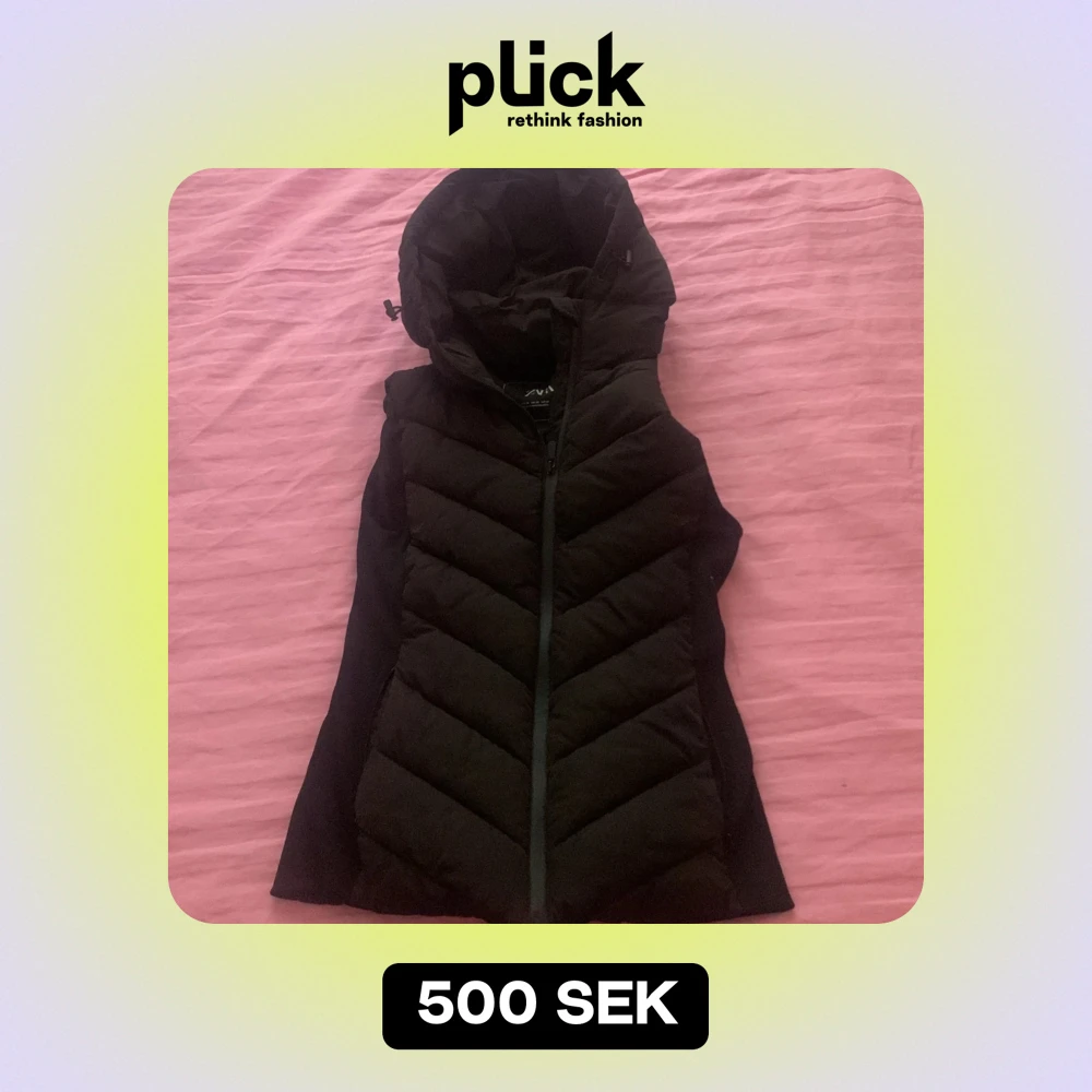 Snygg svart dunväst från Zara med huva och dragkedja. Perfekt för kyligare dagar och ger en stilren look. Västen har ett quiltat mönster som ger extra värme och komfort.