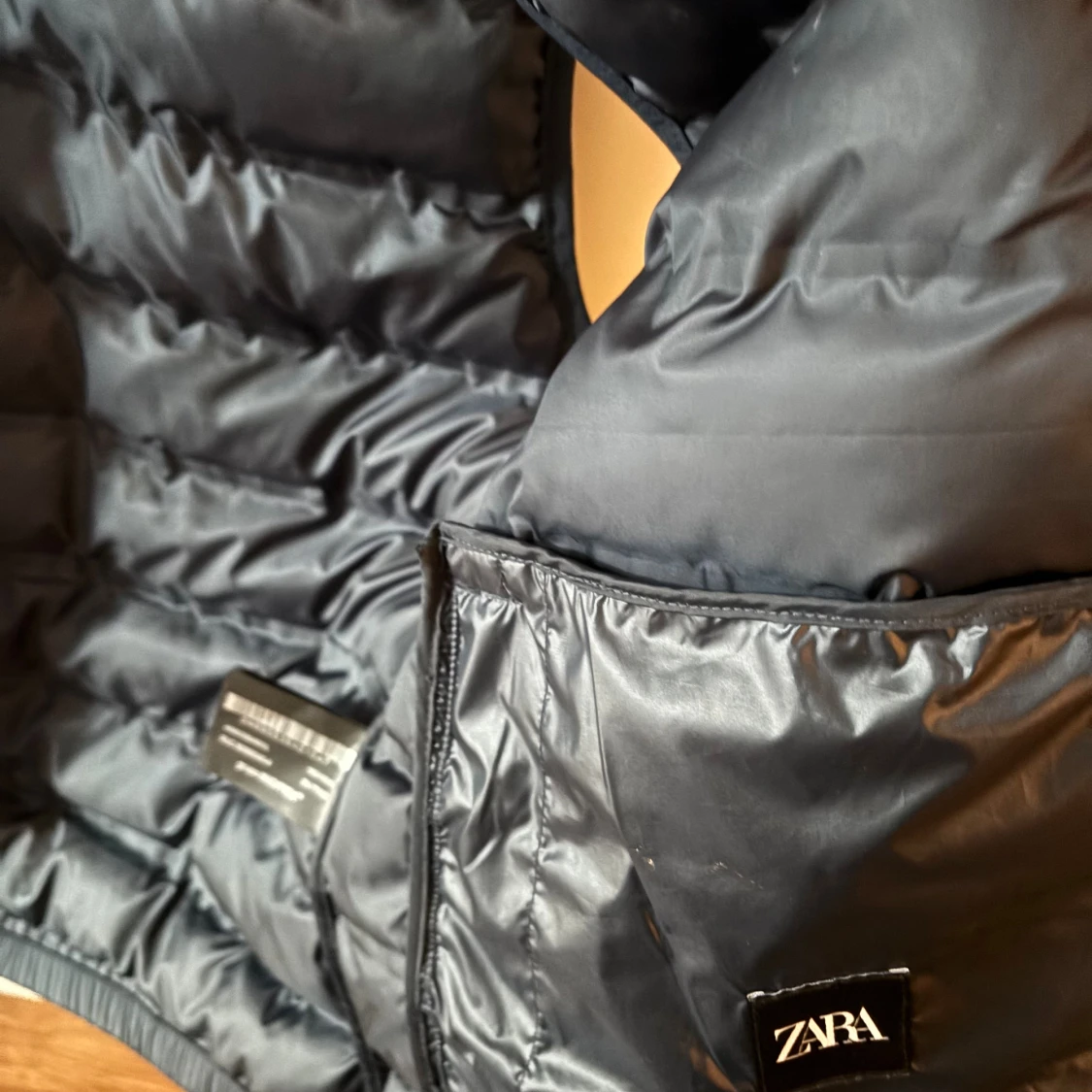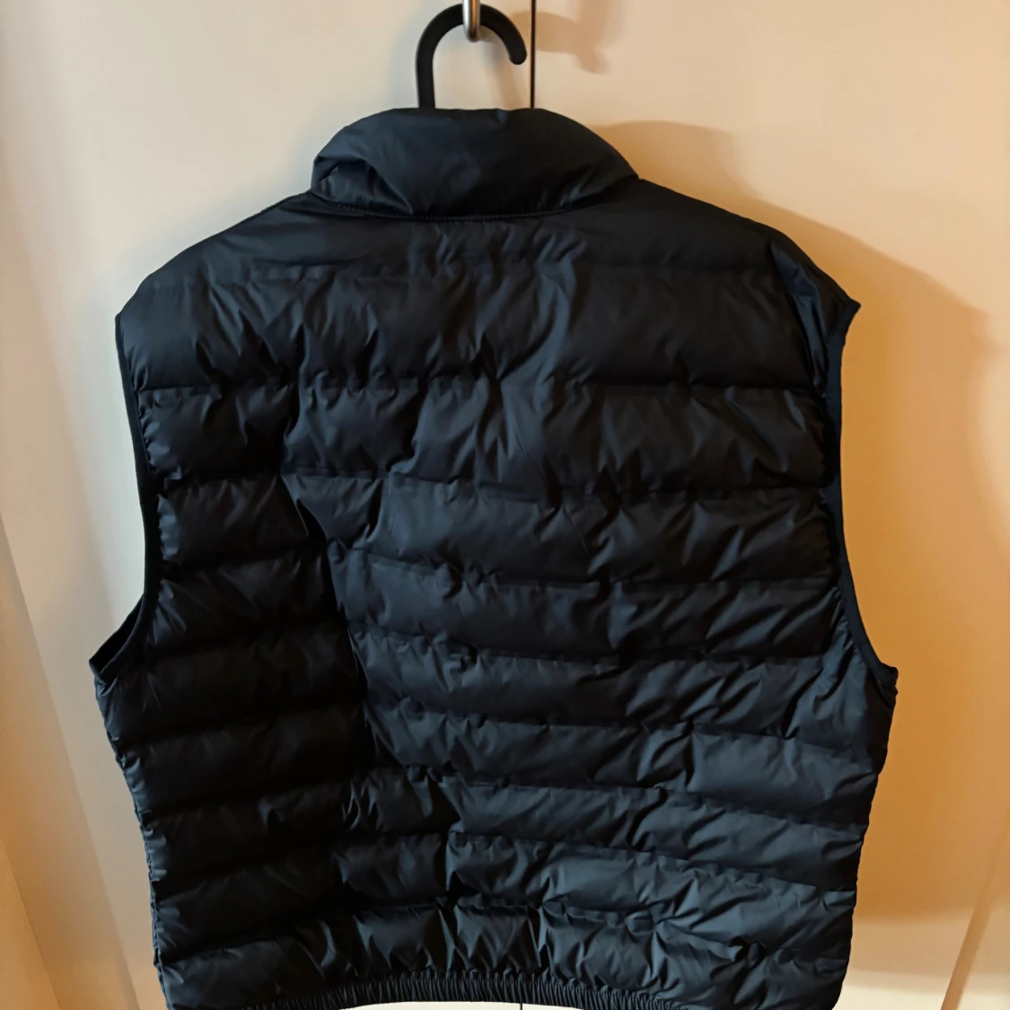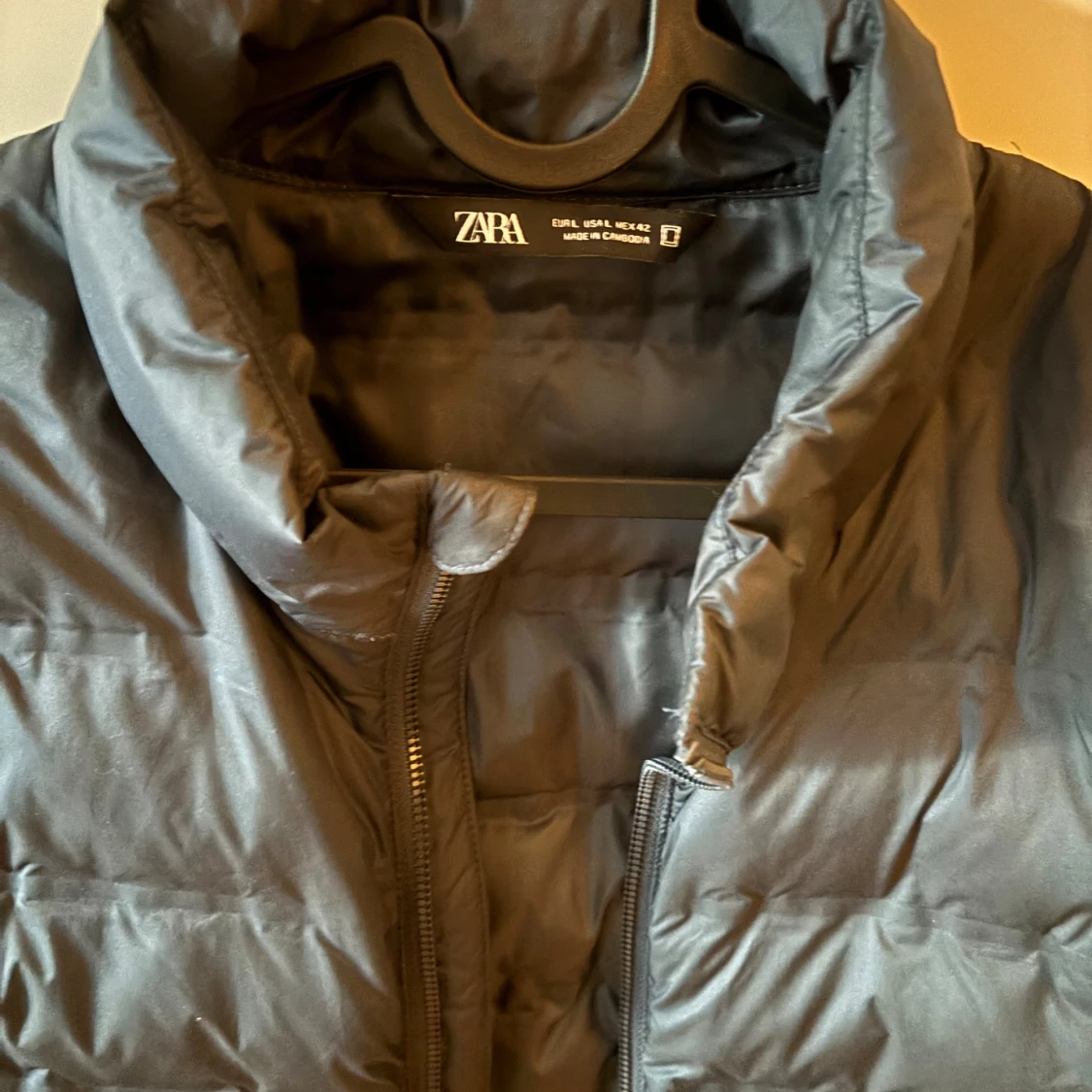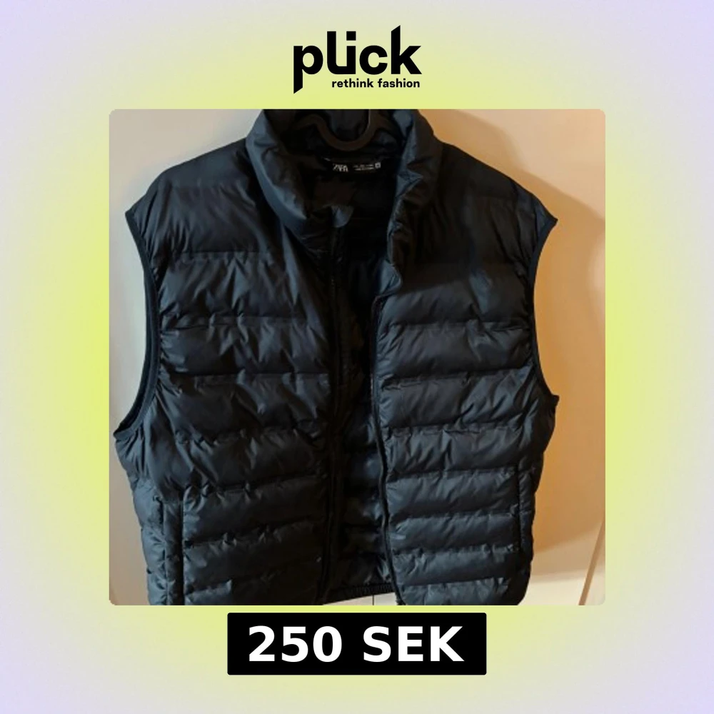 Snygg svart dunväst från Zara med quiltad design och hög krage. Västen har dragkedja framtill och två fickor på sidorna. Perfekt att slänga över en hoodie för en cool och avslappnad look.