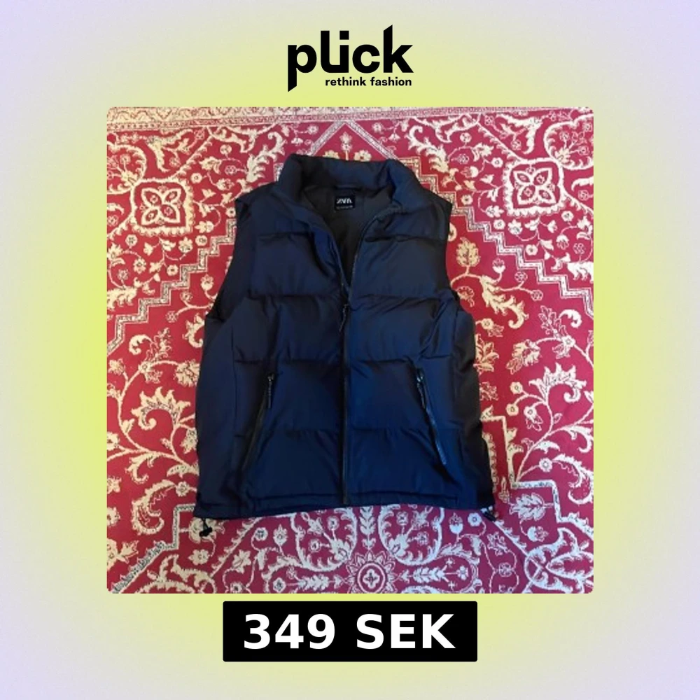 Snygg svart dunväst från Zara med hög krage och två dragkedjefickor framtill. Västen är quiltad och har en stilren look med rak passform. Perfekt att slänga över en hoodie eller tröja när det är kyligt ute.