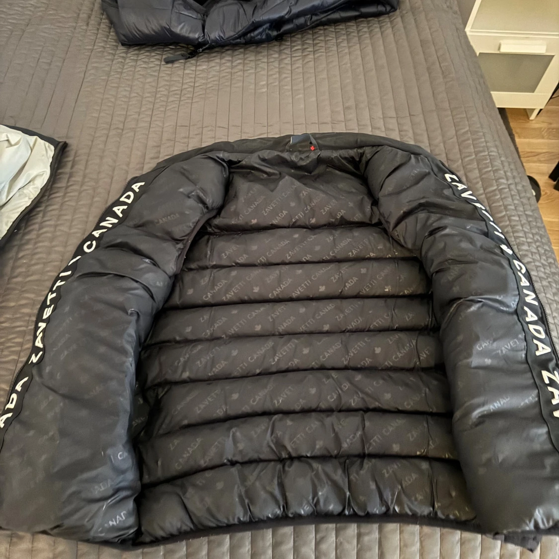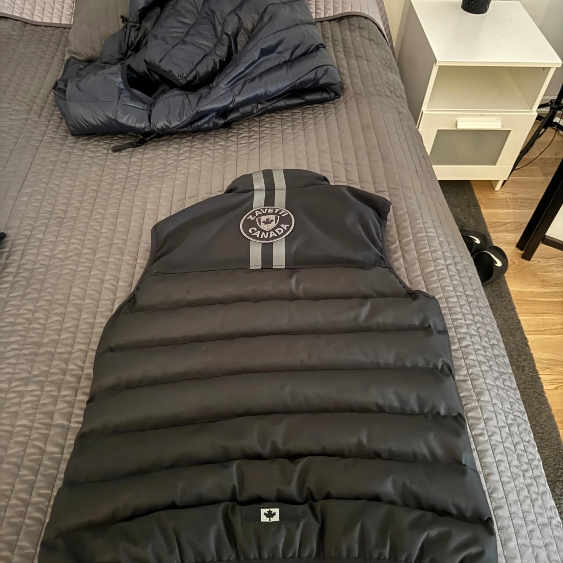 Svart, quiltad dunväst från Zavetti Canada med hög krage och dragkedja framtill. Västen har broderad logga på ryggen, diskreta logotyper på fickorna och insidan, samt två praktiska fickor med dragkedja. Perfekt för lager-på-lager under kyliga dagar.