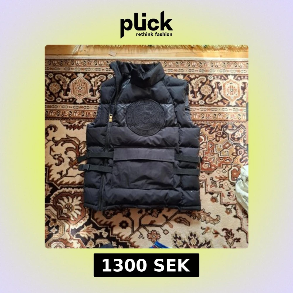 Säljer en svart dunväst med stor broderad logga på bröstet och sned dragkedja. Västen har justerbara band i midjan och en stor ficka framtill. Perfekt för lager-på-lager och streetwear-stil.