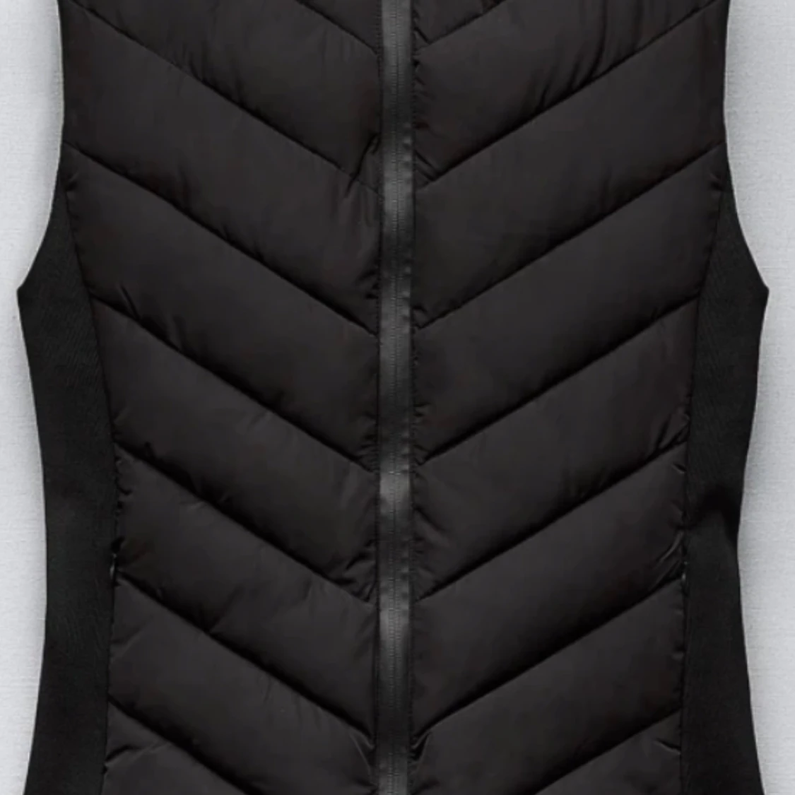 Snygg svart dunväst med dragkedja framtill och diskret mönster i form av sneda sömmar. Perfekt att slänga över en hoodie eller tröja för extra värme. Västen har en stilren och sportig look. Säljer för den kommer en t användning.