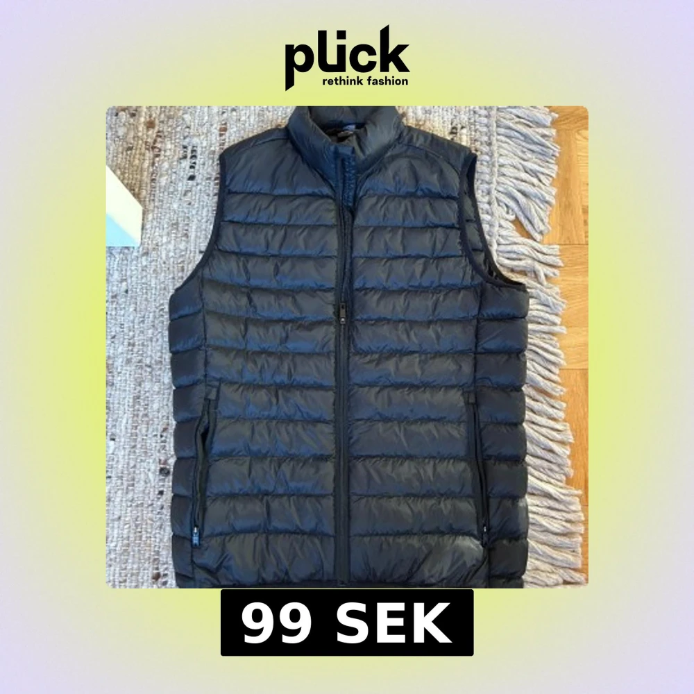Säljer en svart dunväst med horisontella quiltade sömmar och hög krage. Västen har två fickor med dragkedja på sidorna och hel dragkedja framtill. Perfekt att slänga över en hoodie för extra värme. Enkel och stilren design.