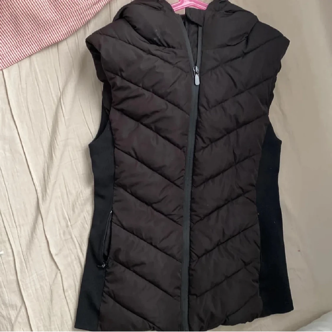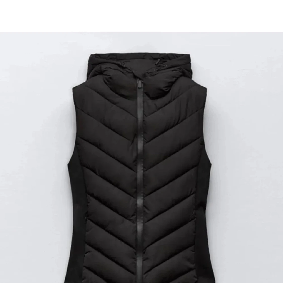 Säljer en svart dunväst med huva och dragkedja framtill. Västen har en figurnära passform och är perfekt för lager-på-lager. Snyggt mönster med diagonala sömmar ger en modern look. Väldigt skön och ger även fin passform. PRIS KAN DISKUTERAS!!