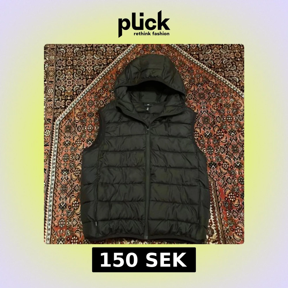 Svart dunväst från H&M i storlek L med quiltad design och praktisk huva. Västen har dragkedja framtill och två sidofickor. Perfekt för lager-på-lager och chill stil under höst och vinter. Materialet är syntet och polyester för lätt och varm känsla.