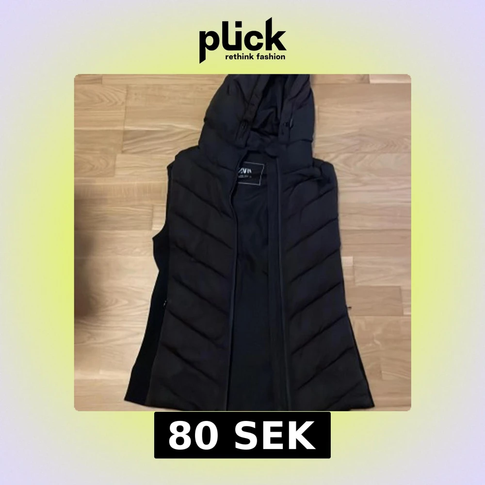 Säljer en svart dunväst från Zara i storlek S. Västen har en stor, vadderad huva med dragsko och snedquiltade paneler. Stängs med dragkedja framtill och är perfekt för lager-på-lager-stil under kyliga dagar. och fickorna är lite tröga