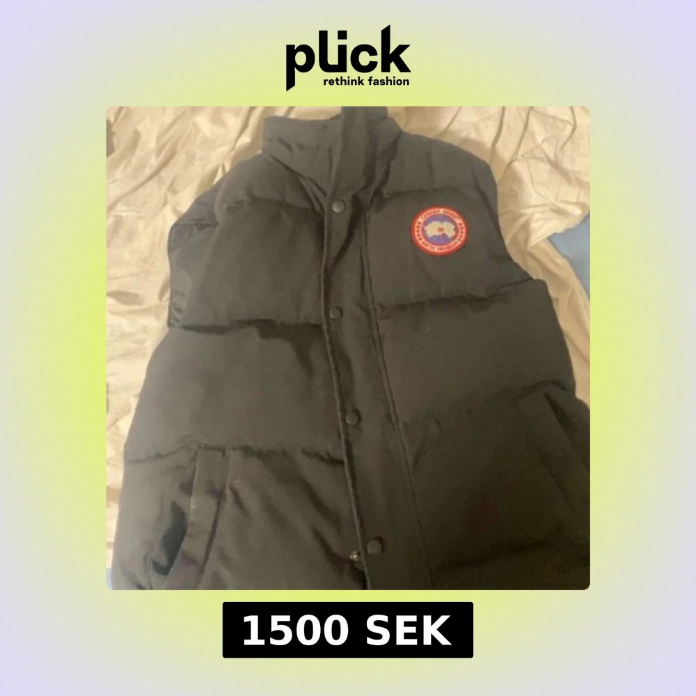 Säljer en svart dunväst från Canada Goose med en hög krage och knappar framtill. Västen har en broderad logotyp på bröstet och är perfekt för kyligare väder.