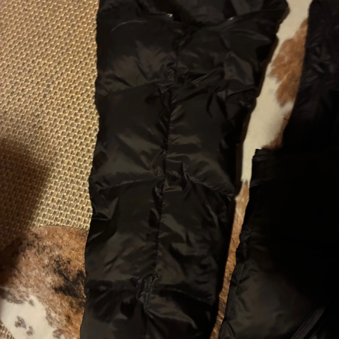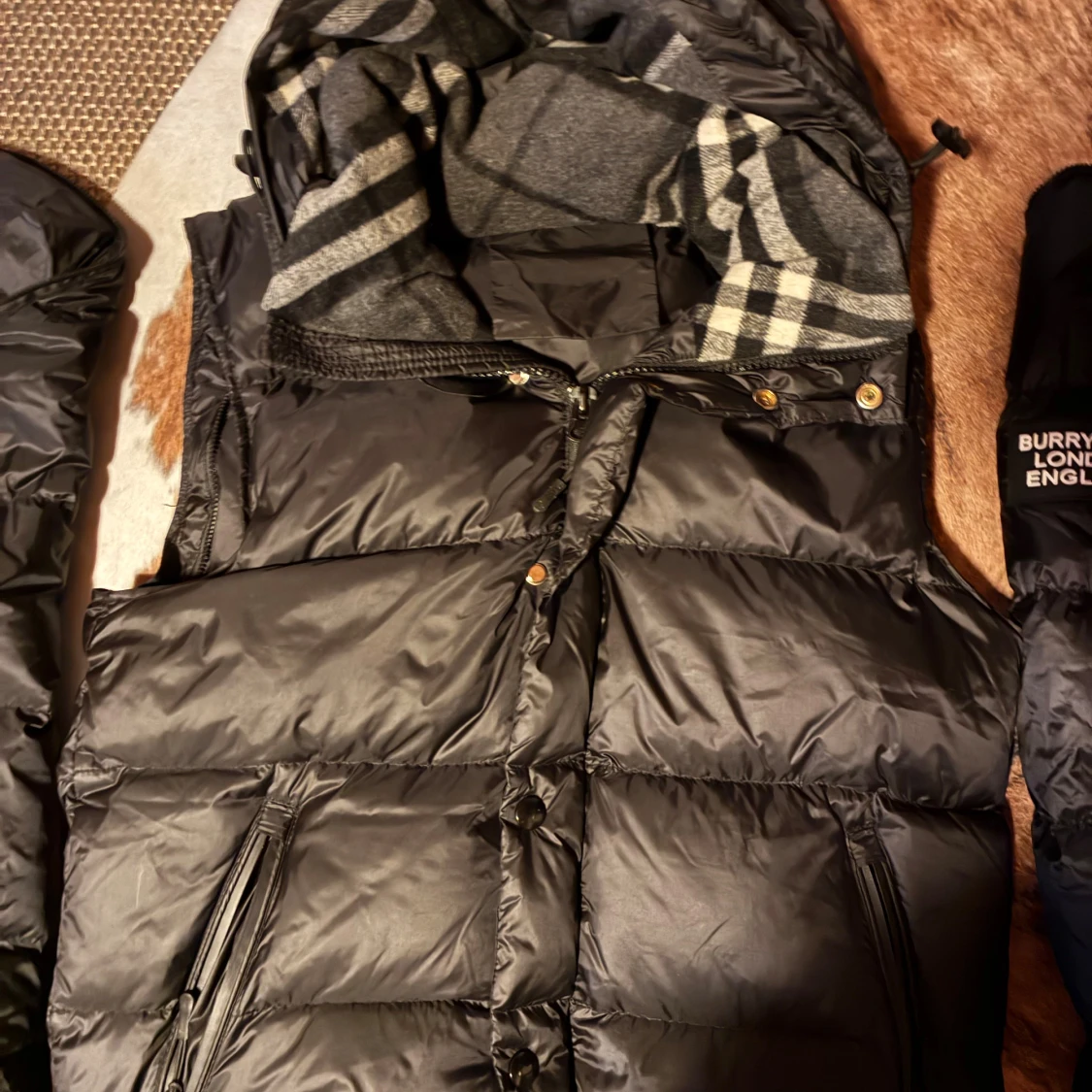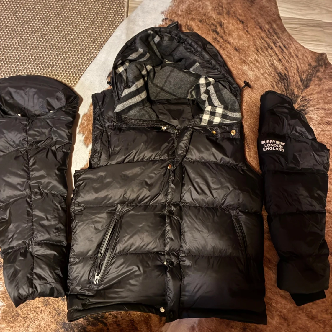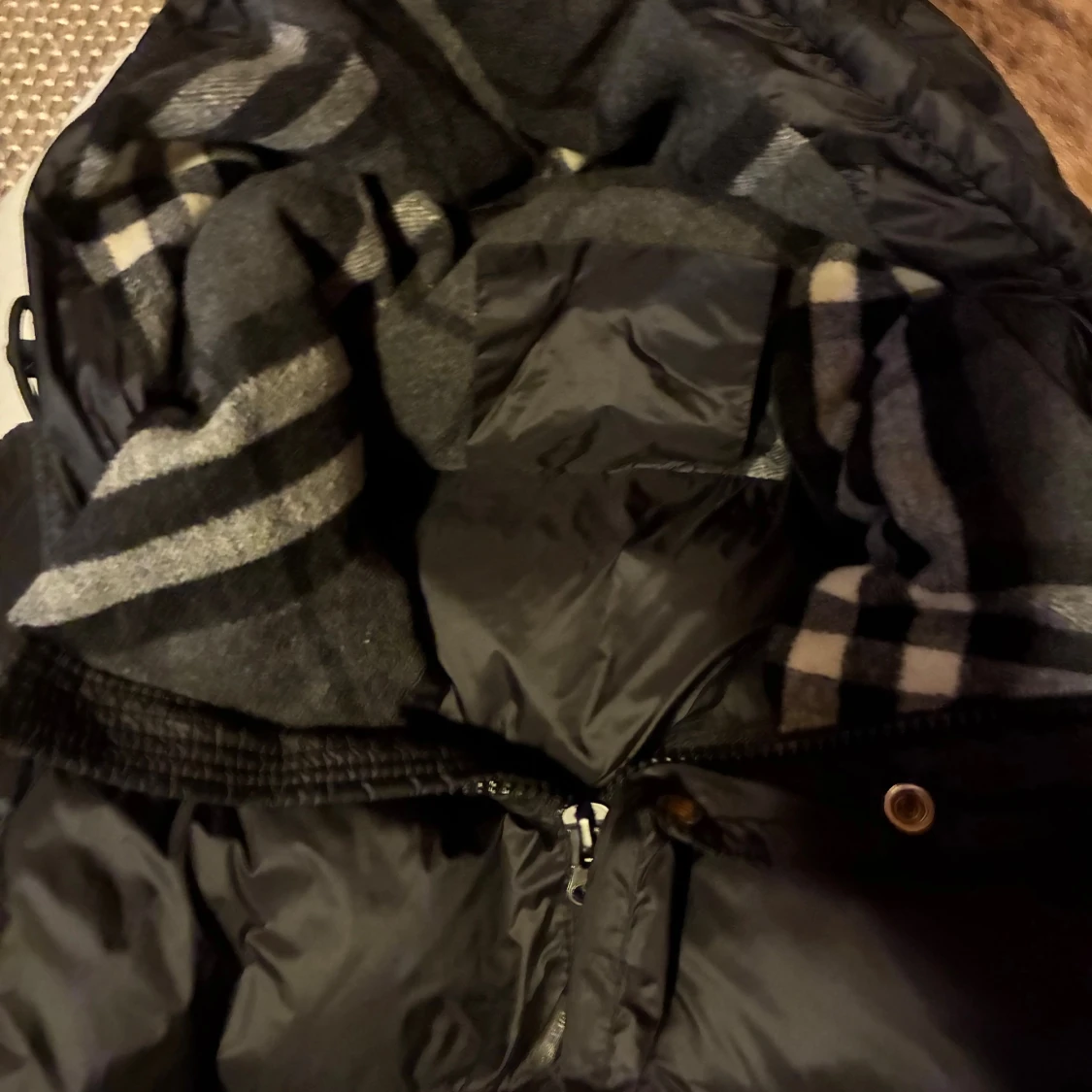 Snygg svart dunväst med rutigt grått och svart foder i huvan. Västen har dragkedja och knappar framtill samt justerbar huva. Perfekt för lager-på-lager och chill höst- eller vinterstil.