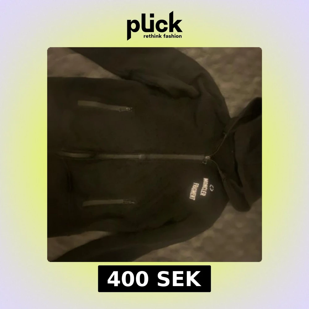 Svart fleecejacka från Moncler Fragment med huva och hel dragkedja. Jackan har två fickor med dragkedja framtill och vit logga på bröstet. Perfekt för dig som gillar streetwear och vill ha något både snyggt och bekvämt.