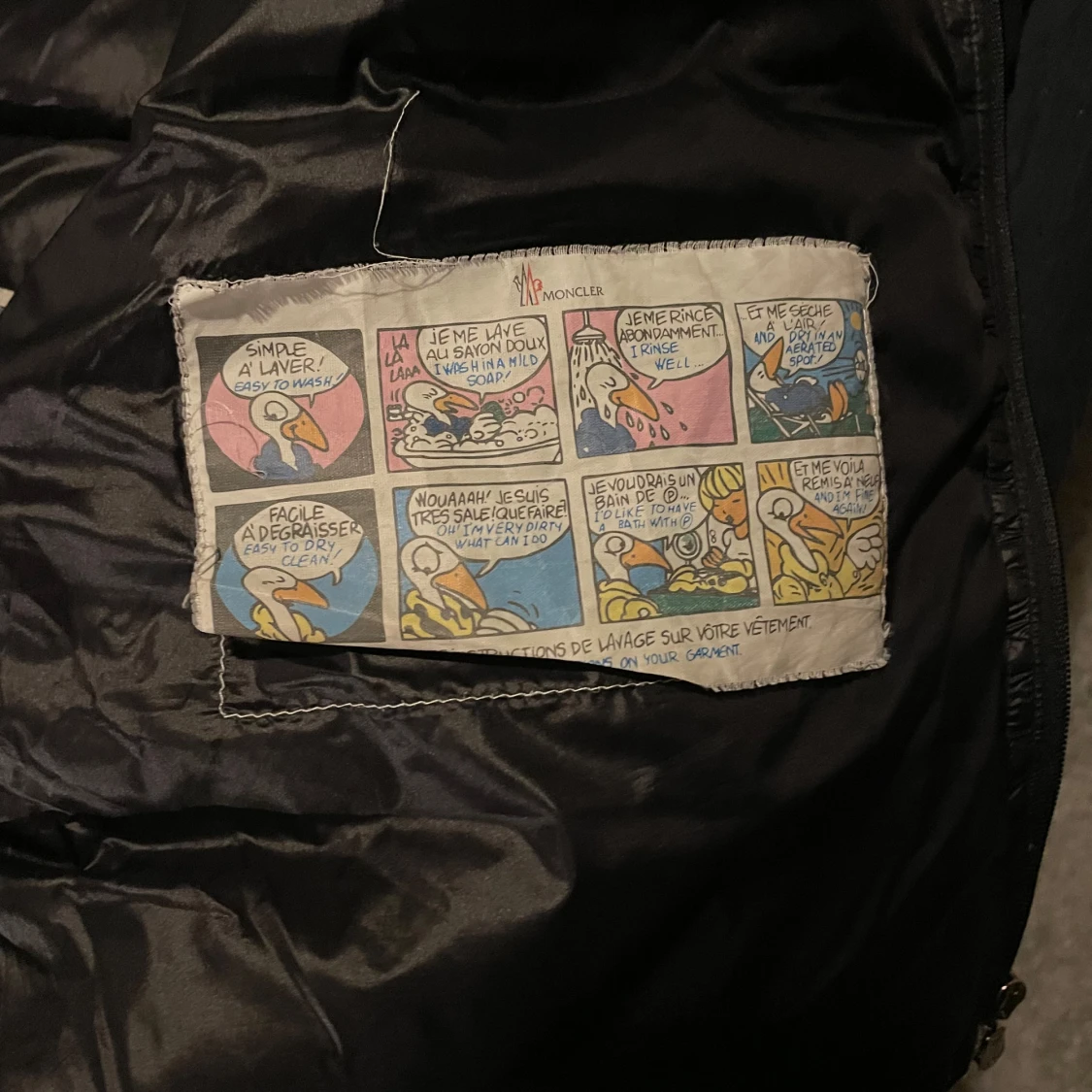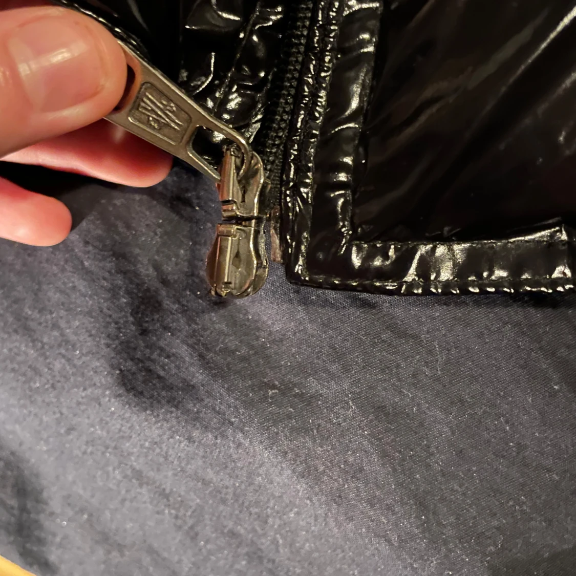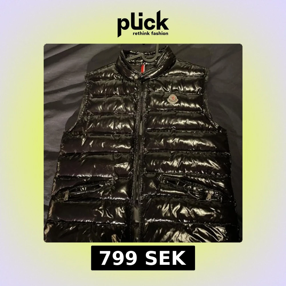 Snygg svart glansig dunväst från Moncler med dragkedja som är lite trasig i botten och två fickor framtill. Perfekt för att hålla värmen med stil. Den har en klassisk Moncler-logga på bröstet och en unik serietidningsetikett på insidan som sitter löst. Inte 100 på om den är äkta där av priset