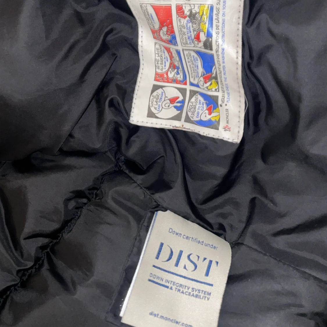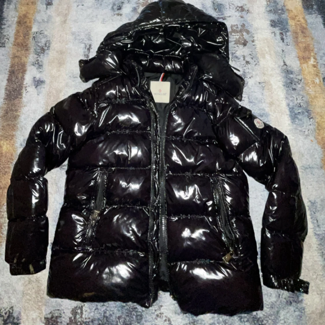 Svart, jacka från Moncler med huva och dragkedja framtill. Jackan har quiltad design, två fickor med dragkedja och klassisk Moncler-logga på armen. NFC’n funkar och QR-koden. Lite problem med dragkedjan med att dra upp men kan funka.