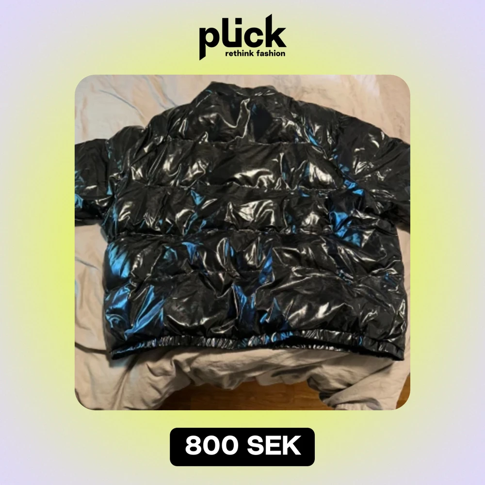 Säljer en svart glansig pufferjacka som är perfekt för kalla dagar. Jackan har en quiltad design och är långärmad med dragkedja framtill. Den är både stilren och varm, vilket gör den idealisk för vinter och höst. Passformen är normal och materialet är syntetiskt, vilket ger en cool look.