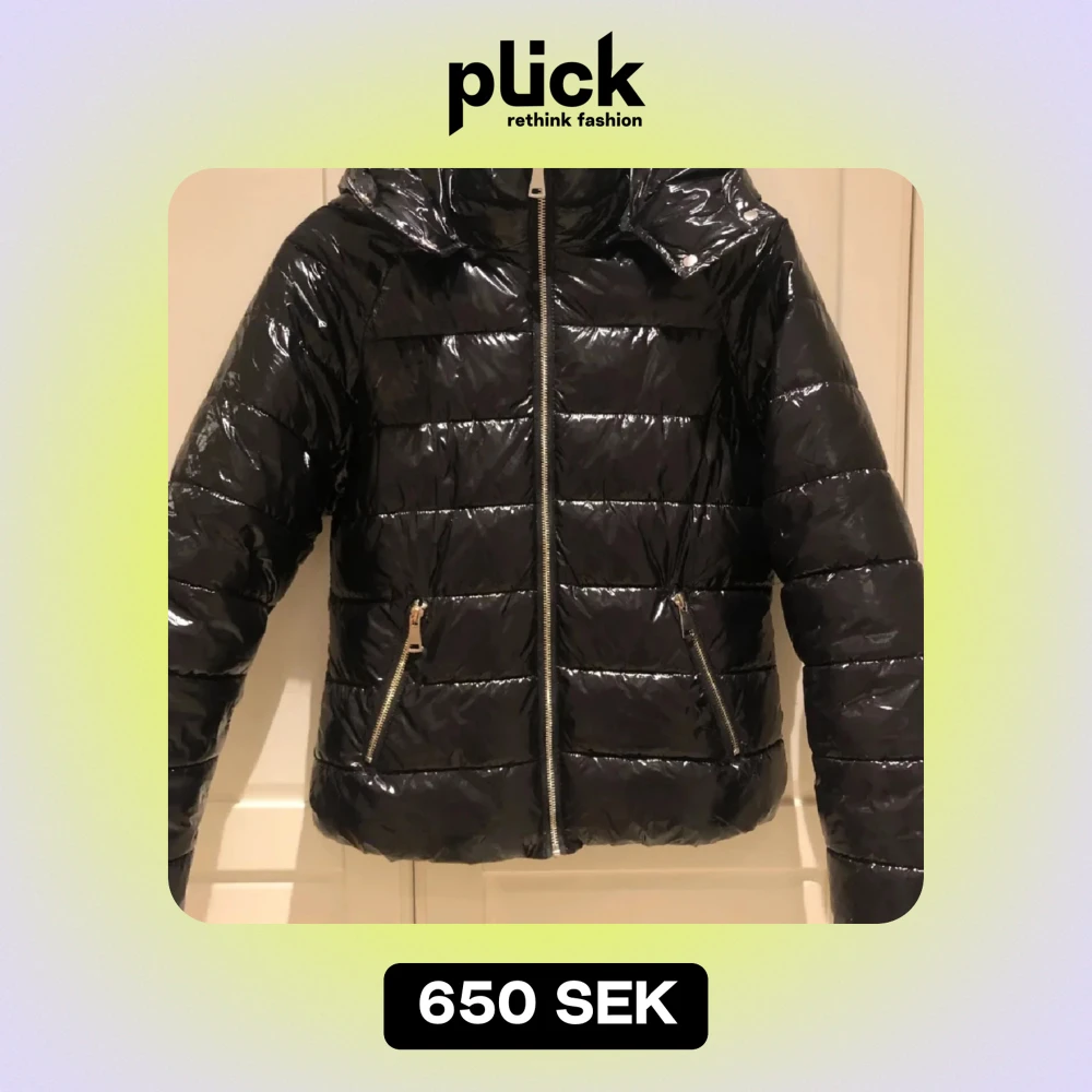 Säljer en svart glansig jacka! Använd ca en månad så inga tecken på användning😊