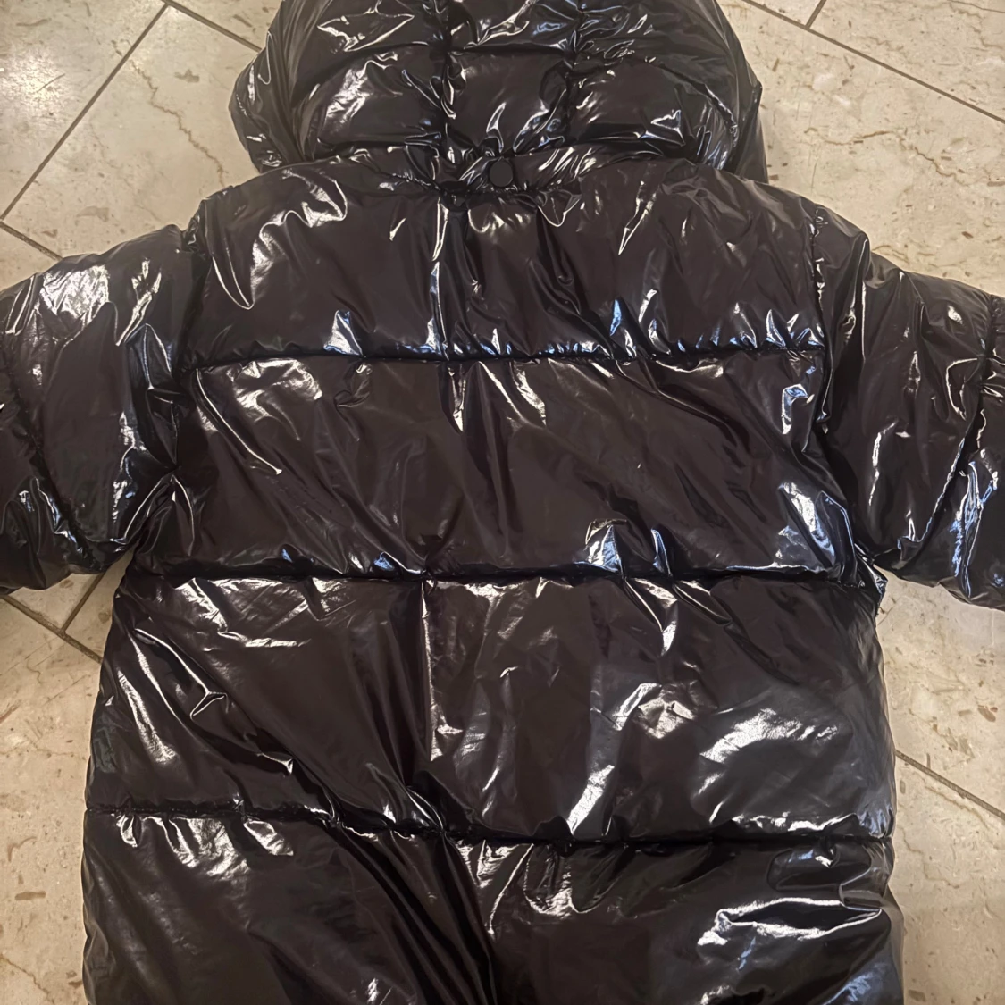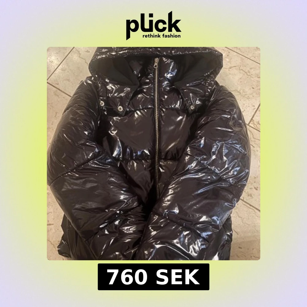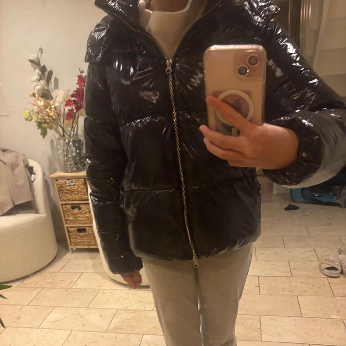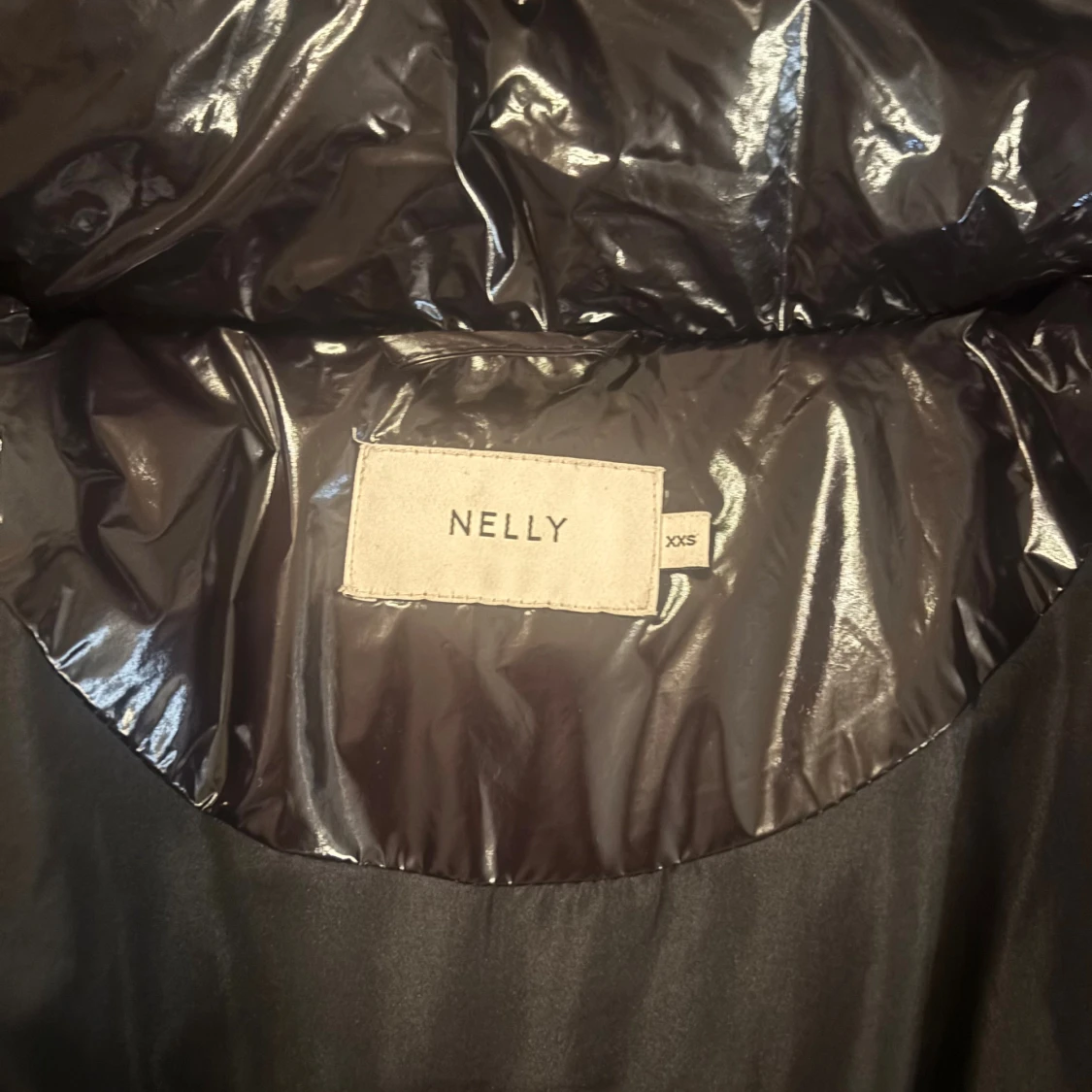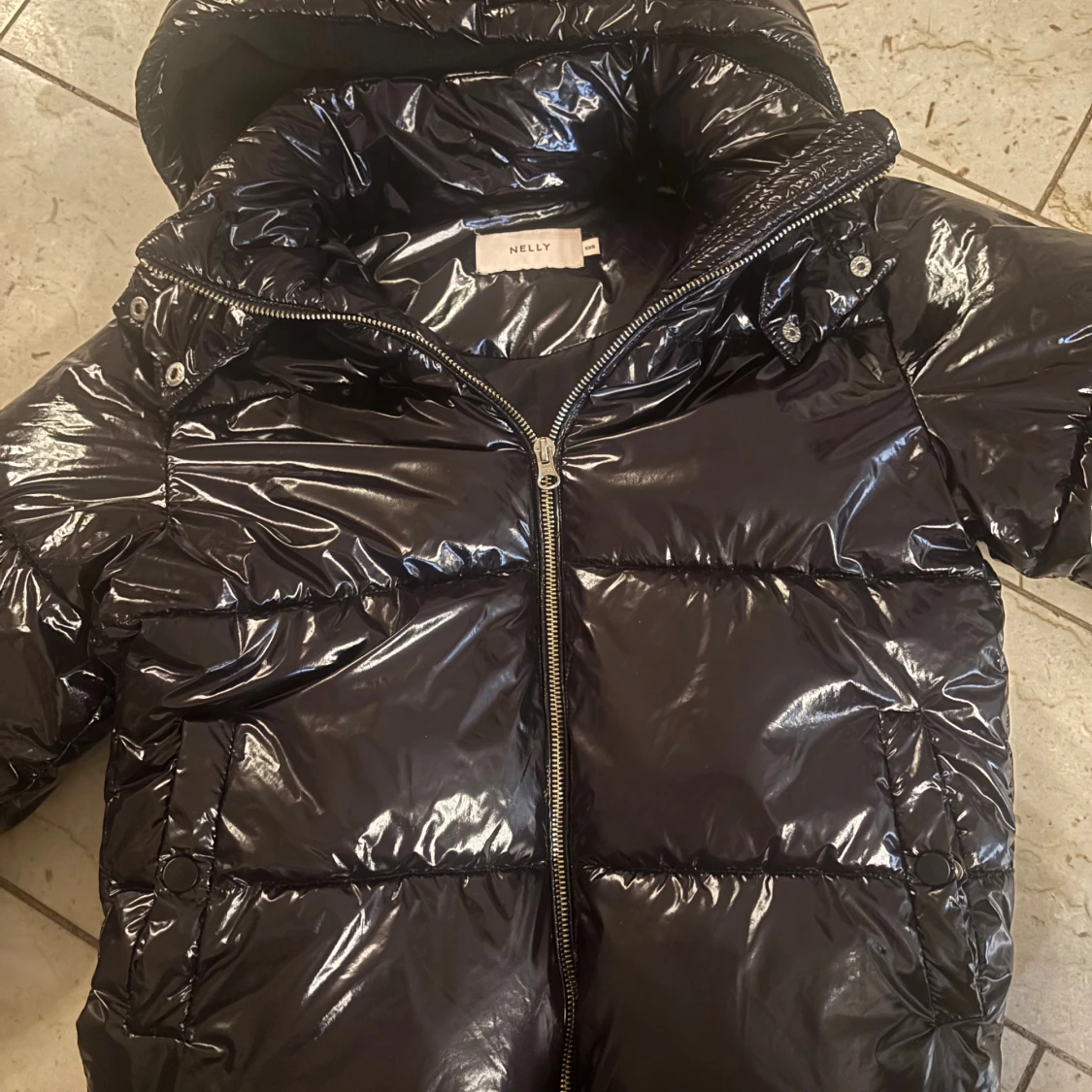 Svart pufferjacka från Nelly med glansig finish och huva. Jackan har dragkedja framtill, stora fickor och quiltad design. Perfekt för kalla dagar! Använd minst 2 ggr. Inga tecken på användning💕