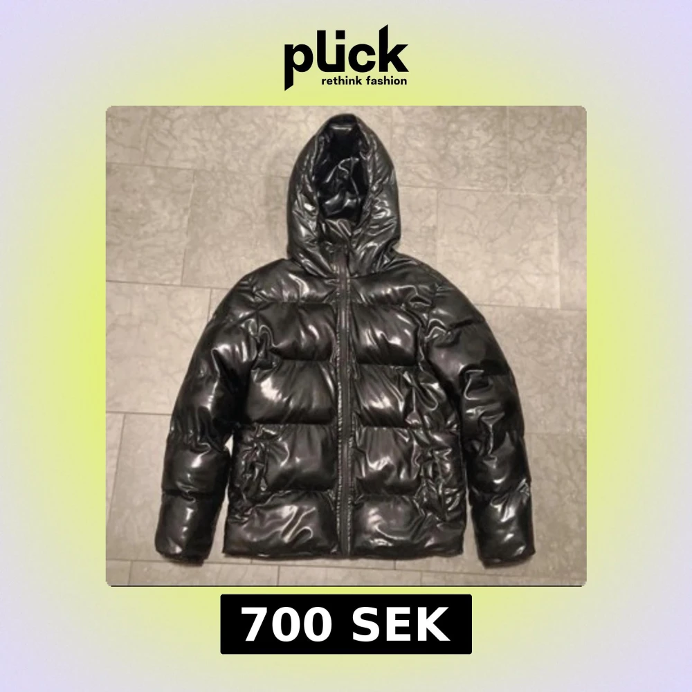 Säljer en svart pufferjacka med glansig finish och huva. Jackan har dragkedja framtill och breda, vadderade kanaler som ger en riktigt fet look. Perfekt för kalla dagar när du vill hålla stilen och värmen.