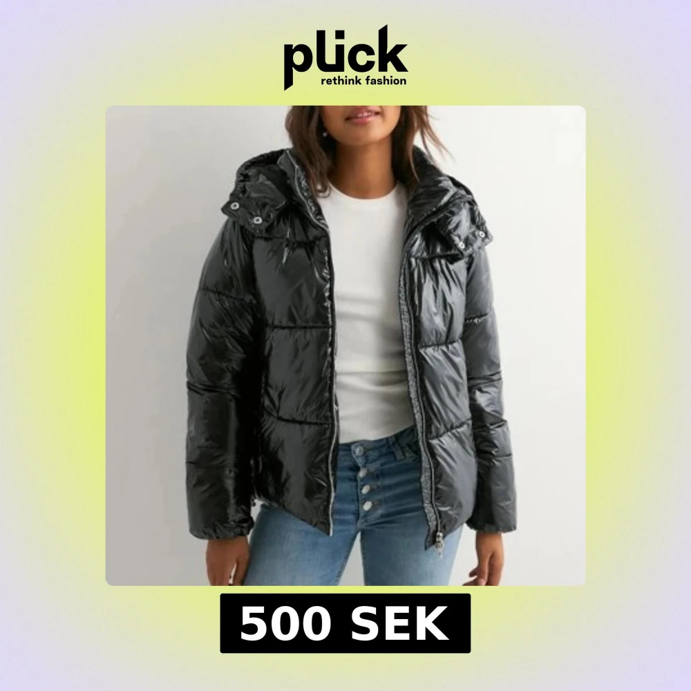 Snygg svart pufferjacka med glansig finish och huva. Jackan har dragkedja framtill och breda, quiltade partier som ger en cool och modern look. Perfekt för kalla dagar när du vill hålla stilen.