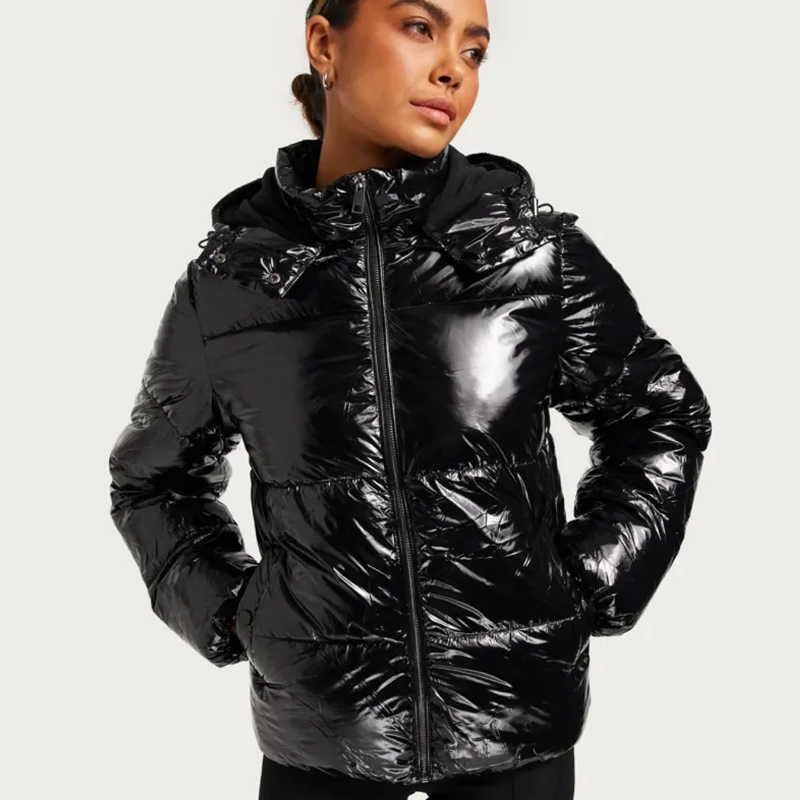 Svart trendig pufferjacka med glansig finish och huva. Jackan är i mycket bra skick och endast använd 3 gånger❣️
