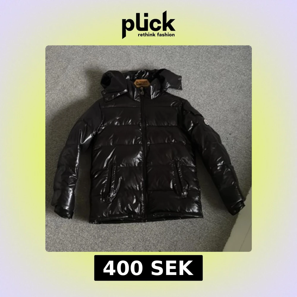 Snygg svart pufferjacka med glansig finish och dragkedja framtill. Jackan har en praktisk huva och två fickor med knappar. Perfekt nu på vintern! ALLDRIG ANDVÄND!