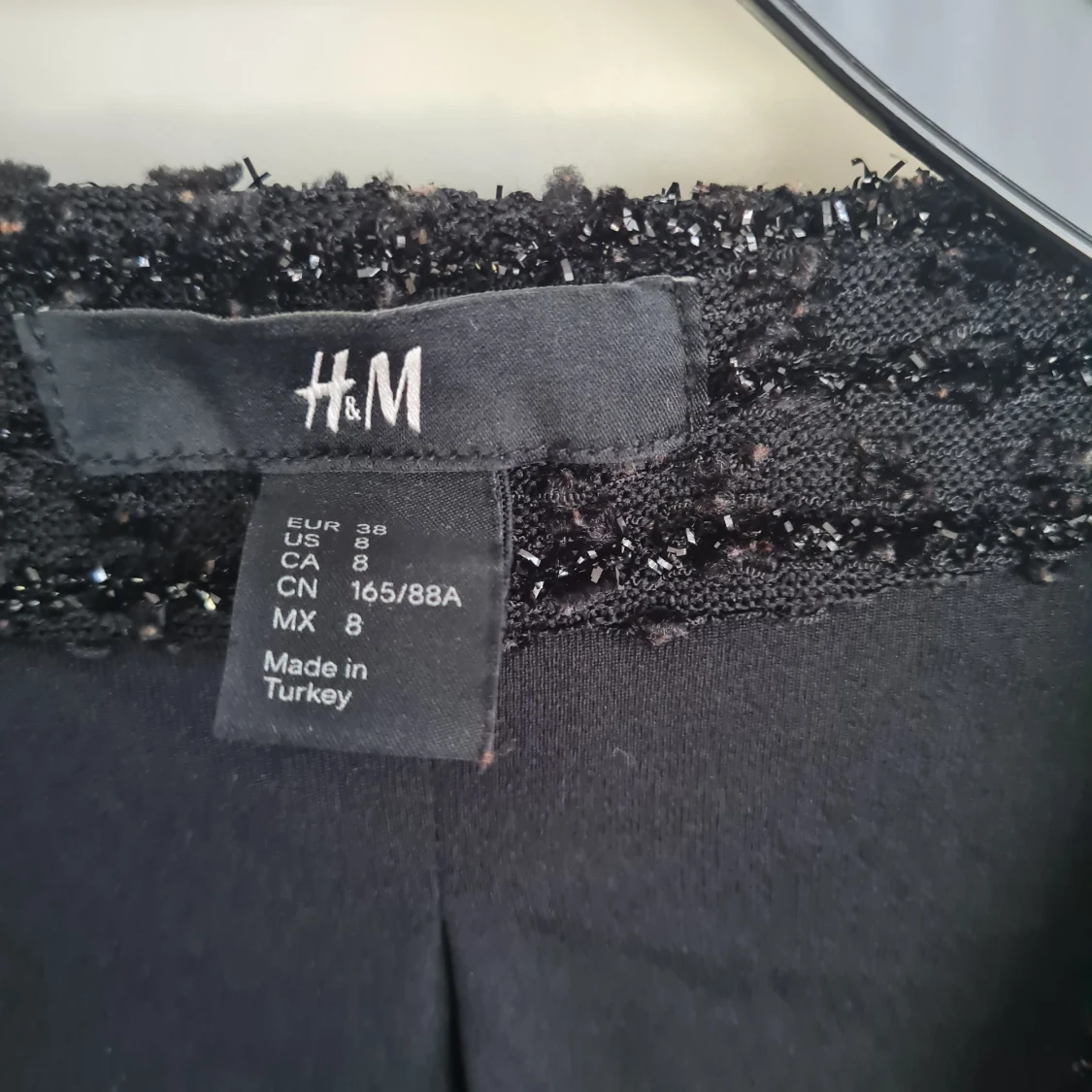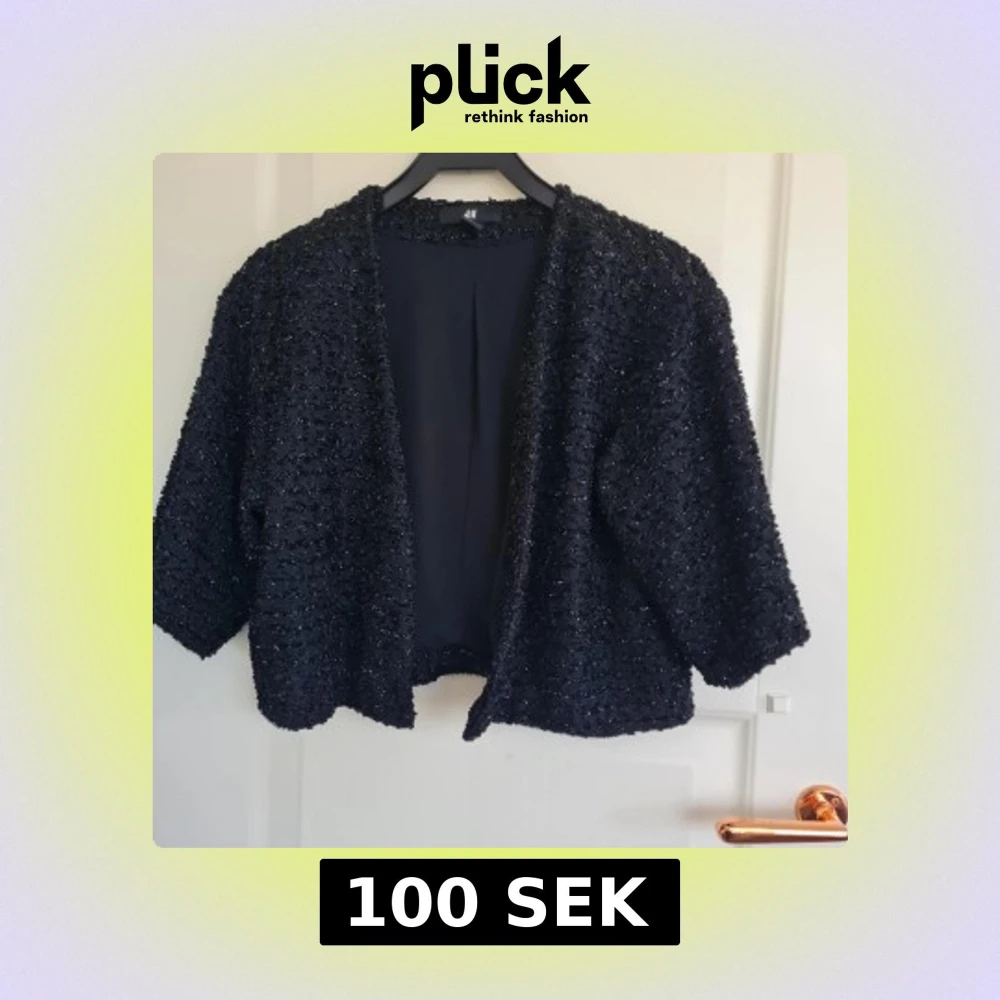 Säljer en svart glittrig kavajjacka från H&M med trekvartsärm och öppen front. Jackan har en croppad passform och är tillverkad i ett strukturerat tyg med glittriga detaljer. Perfekt för att lyfta en outfit!