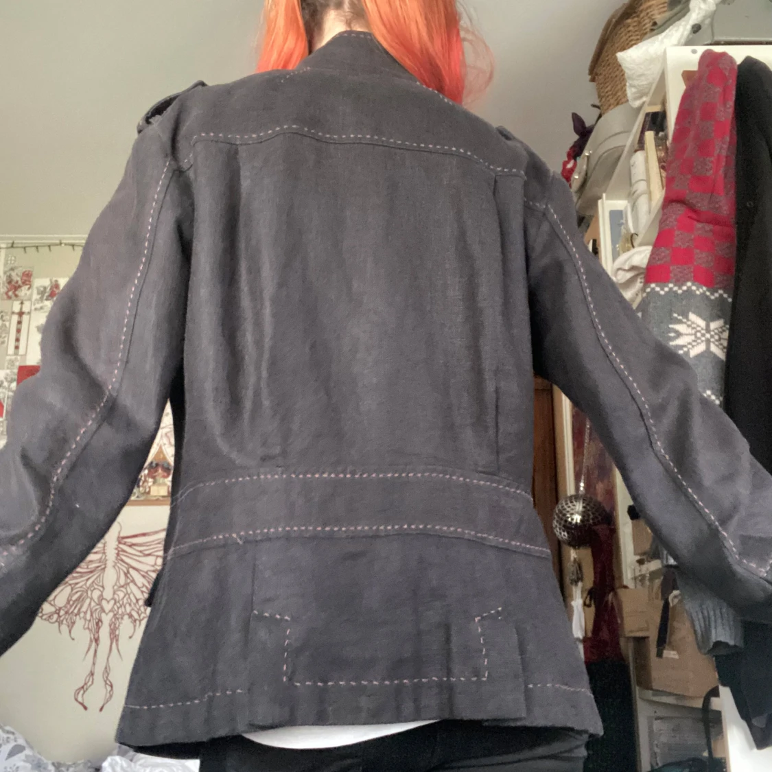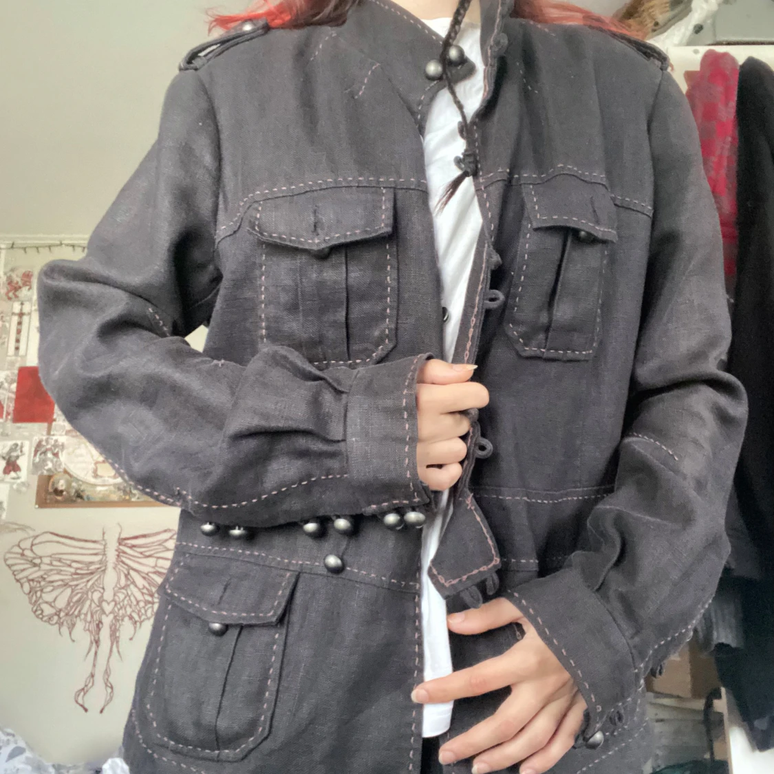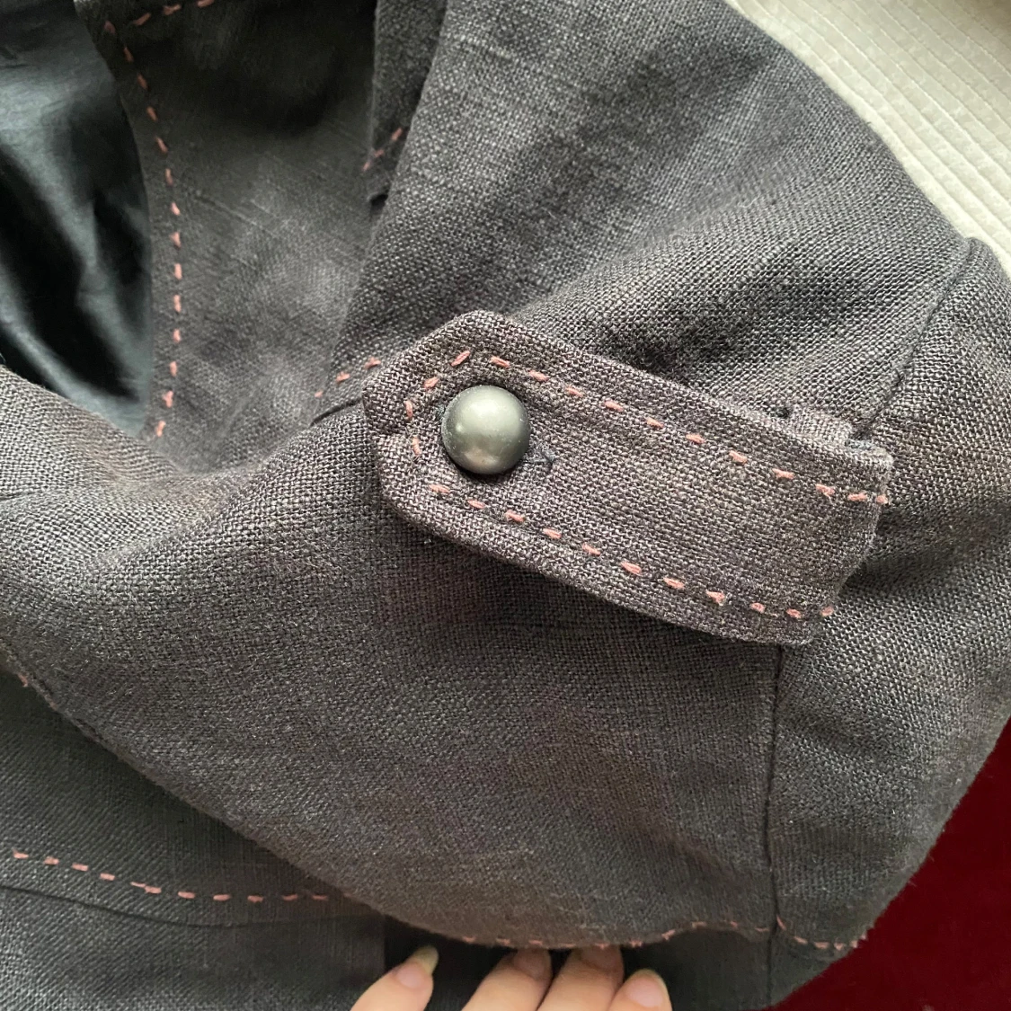 cool jacka med bruna accentuerade sömmar och många praktiska fickor. i mjukt linne/bomull med lent foder. snygga knappar som dekoration. har en fantastisk tyngd och känns exklusiv!