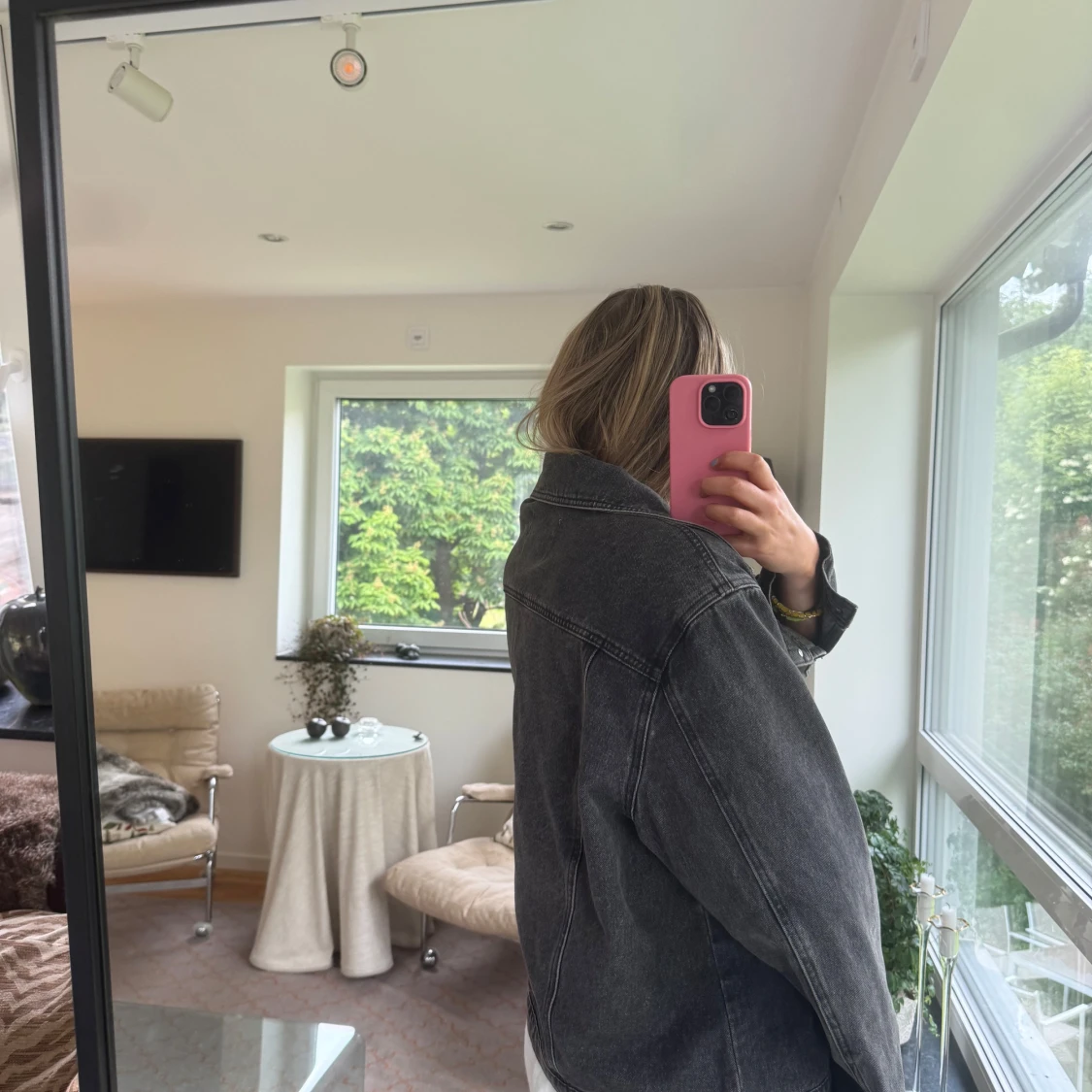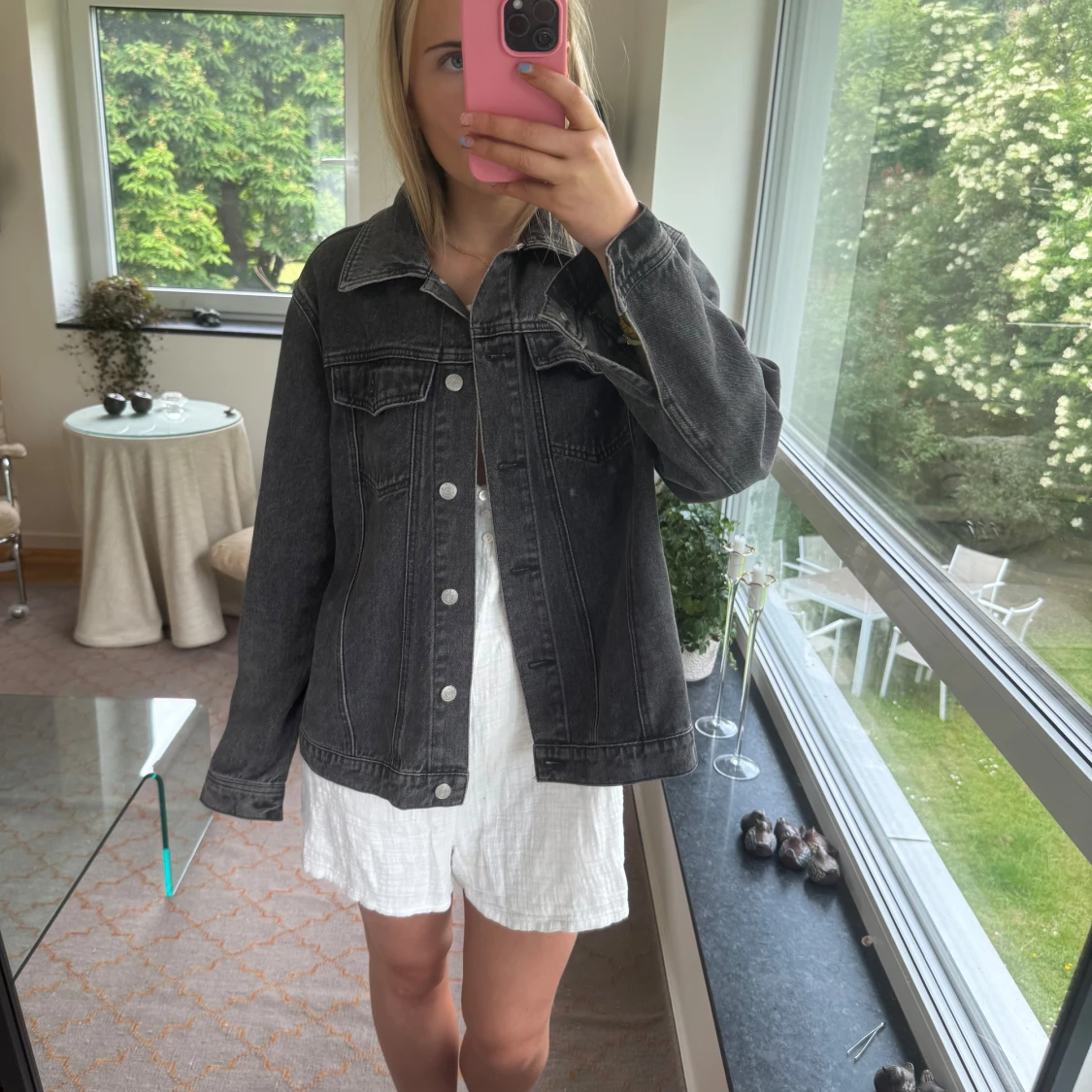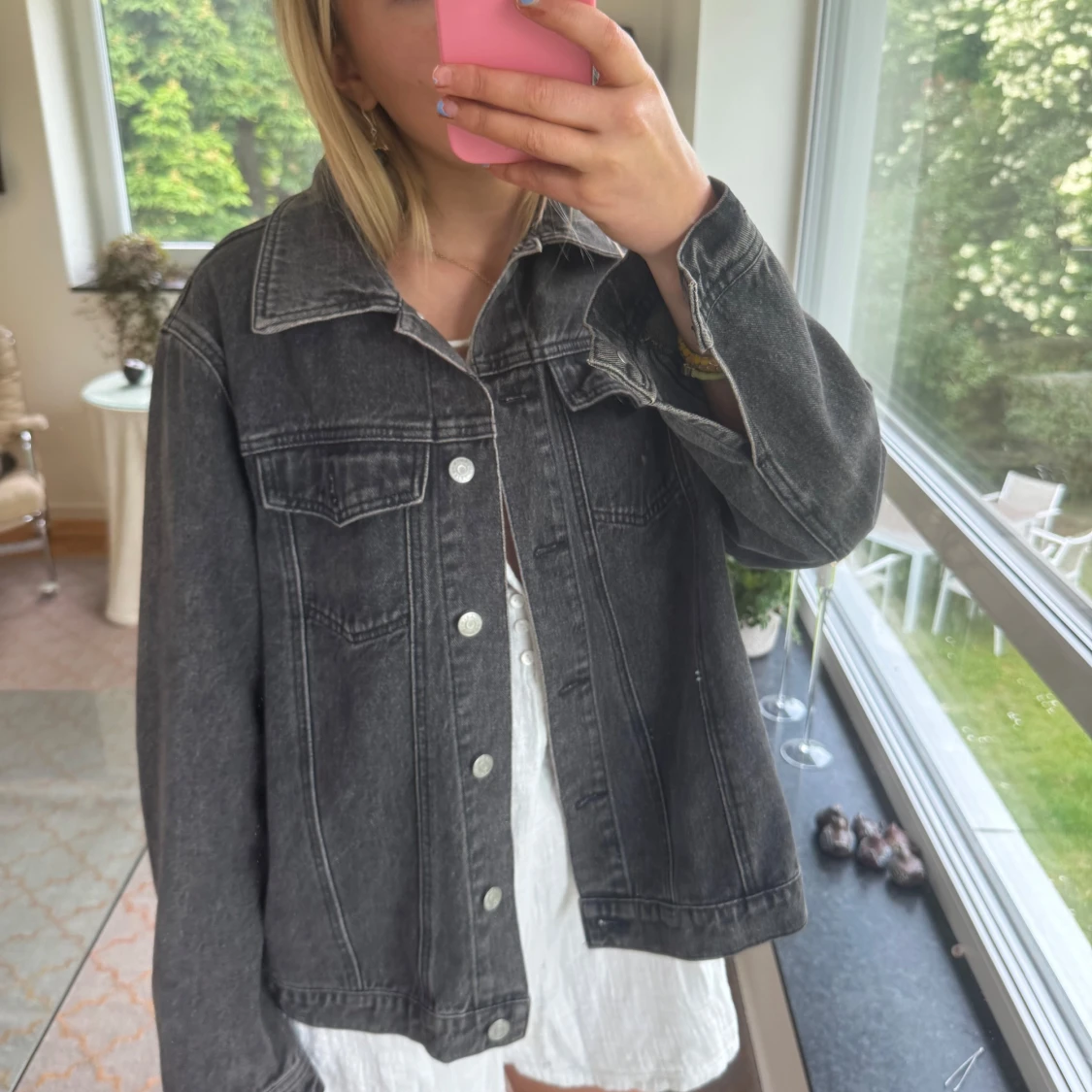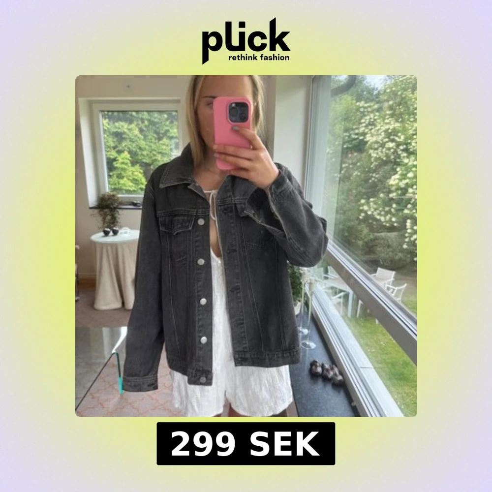 Säljer en svart jeansjacka i oversized modell med klassisk krage och silverfärgade knappar. Jackan har två bröstfickor med lock och raka sömmar som ger en clean look. Perfekt att slänga över en hoodie eller klänning för en chill vibe.