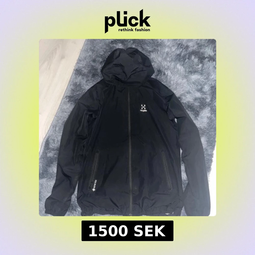 Svart vindjacka från Haglöfs med huva och hel dragkedja framtill. Jackan är tillverkad i Gore-Tex-material som är både vatten- och vindtätt, perfekt för blåsiga och regniga dagar. Två sidofickor med dragkedja och meshfoder på insidan för extra komfort.