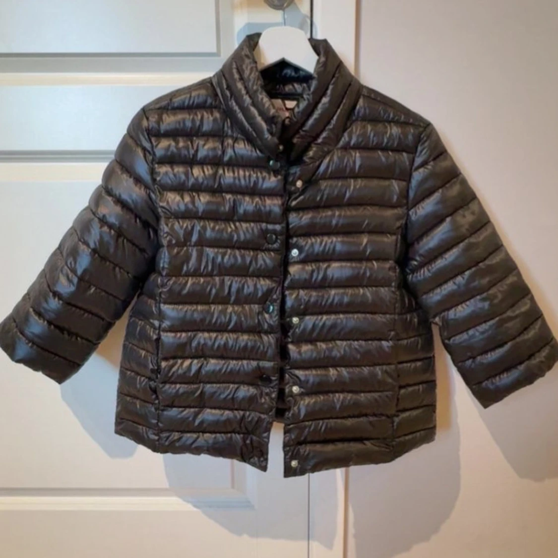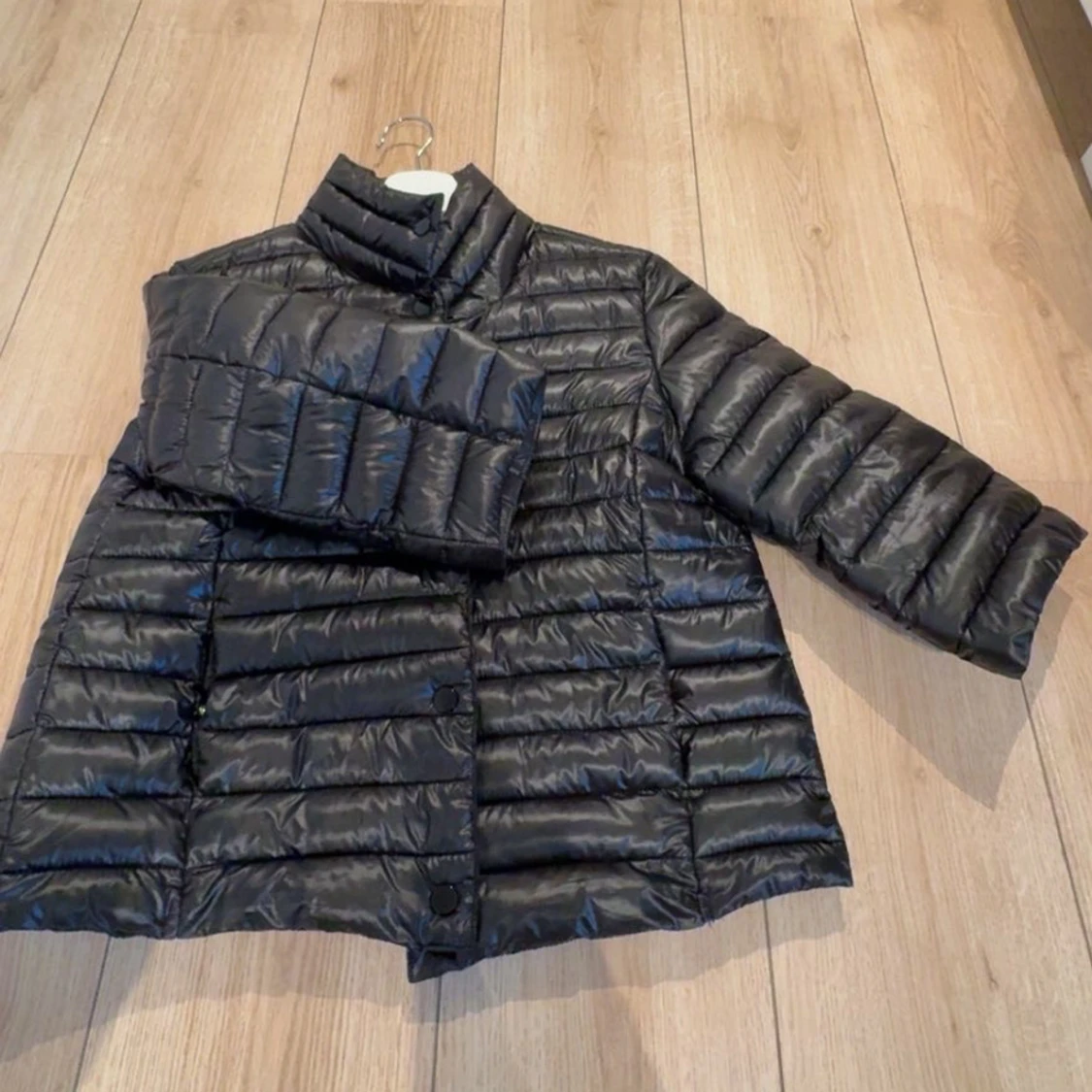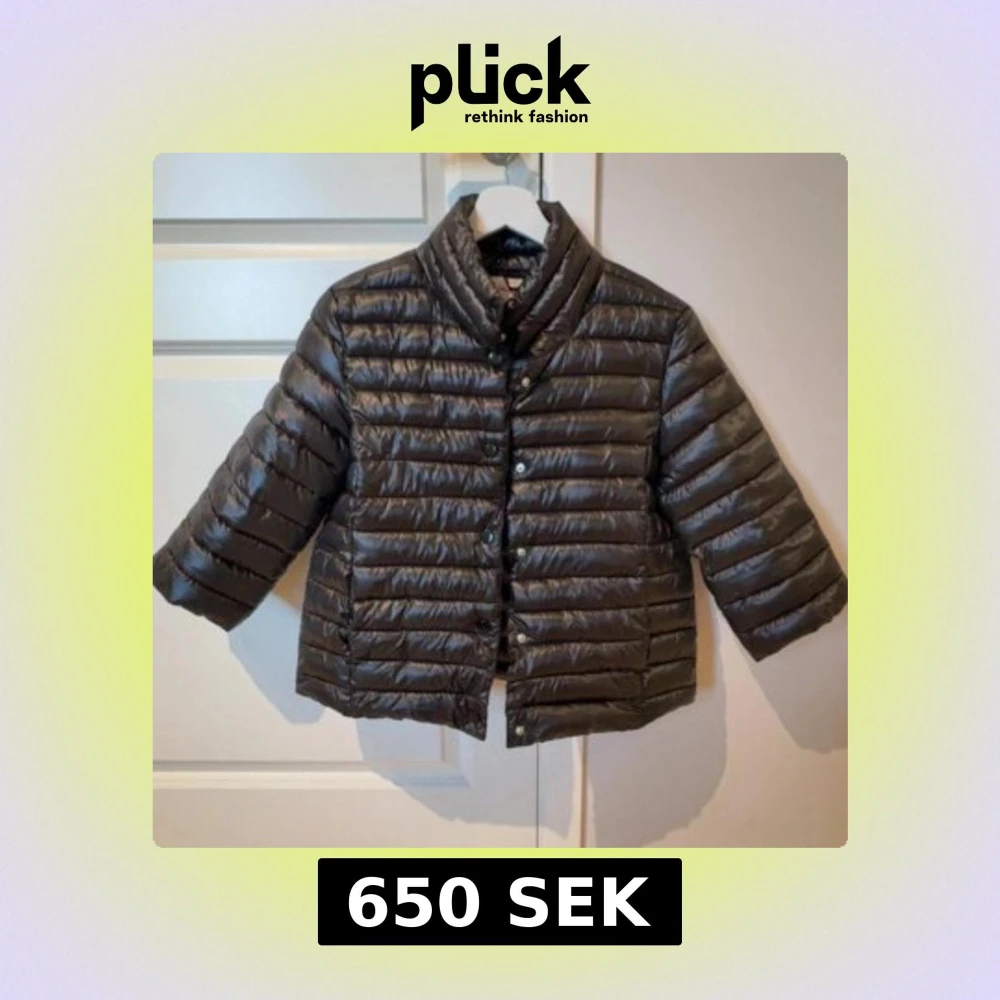 Snygg svart pufferjacka med hög krage och horisontella sömmar. Jackan har knäppning framtill och en boxig, lite kortare passform. Perfekt för kyliga dagar och enkel att styla till det mesta.💕
