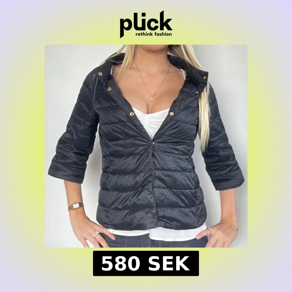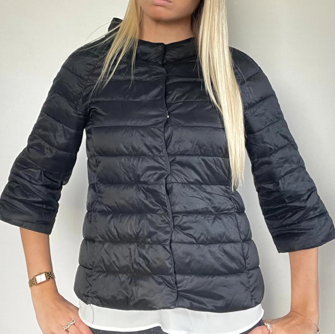 FÖLJ FÖR LIKNANDE🩷 svart trekvartsärmad herno liknande jacka i äkta dun som är mycket lik originalet! Perfekt i höst och vinter då den är varm! Storlek XS i perfekt skick. Fina guld detaljer! Tryck köp nu! TK-0065