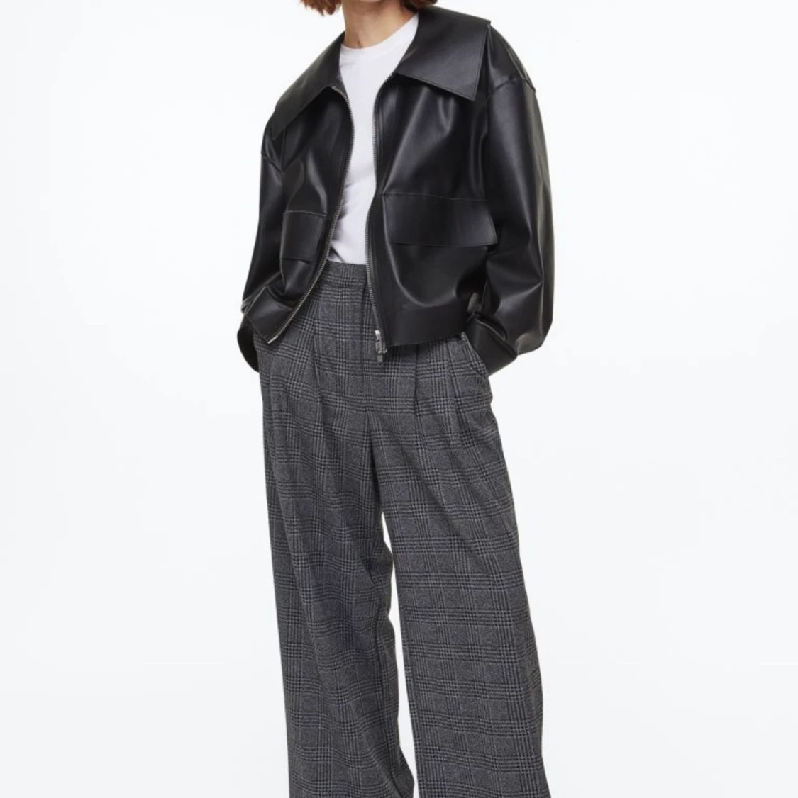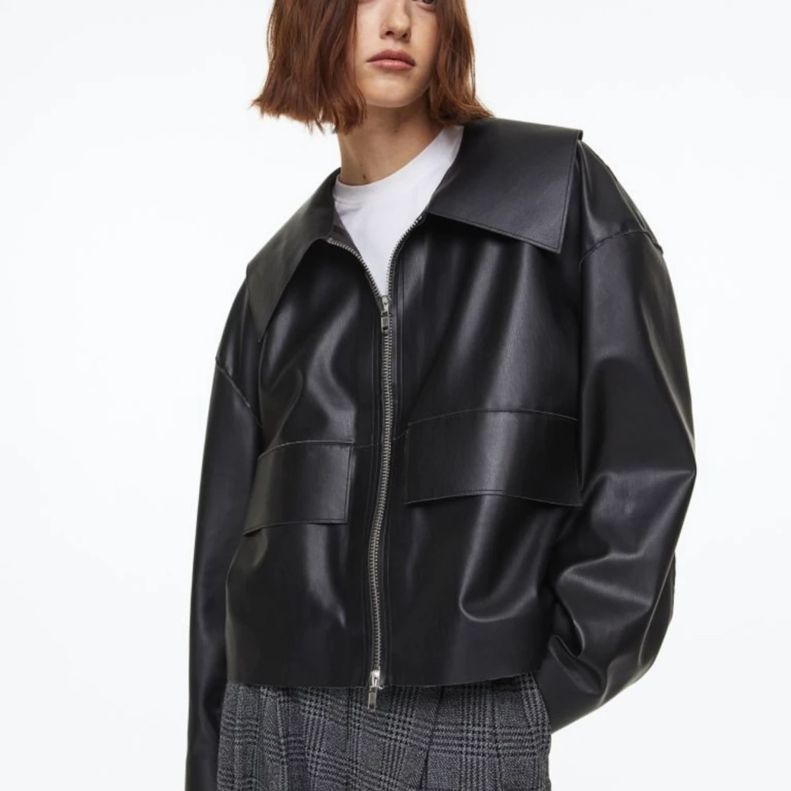 Ny läderjacka från HM. Köpt i våras, använd Max 2 gånger. Vegansk läder. Köpt för oversized look. Supersnygg på!