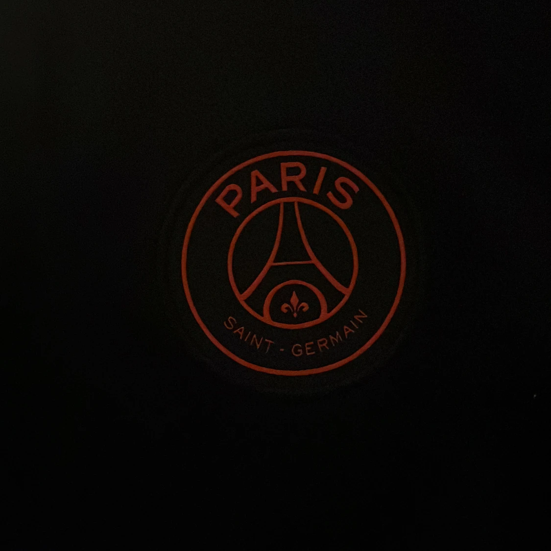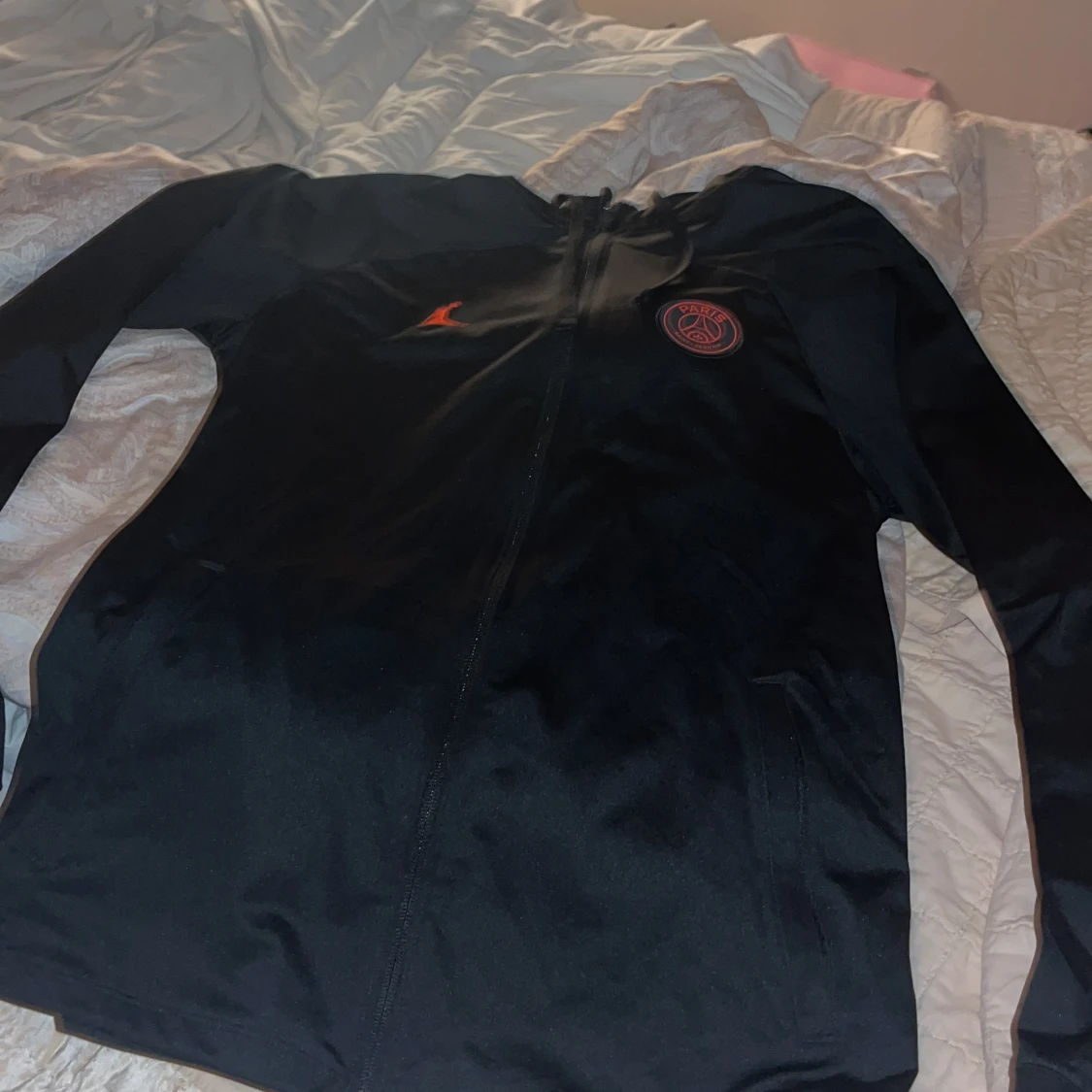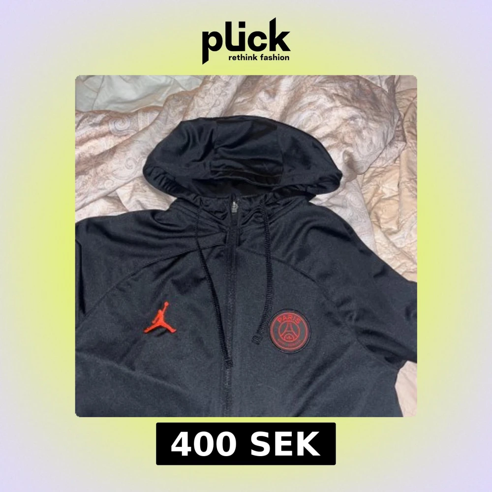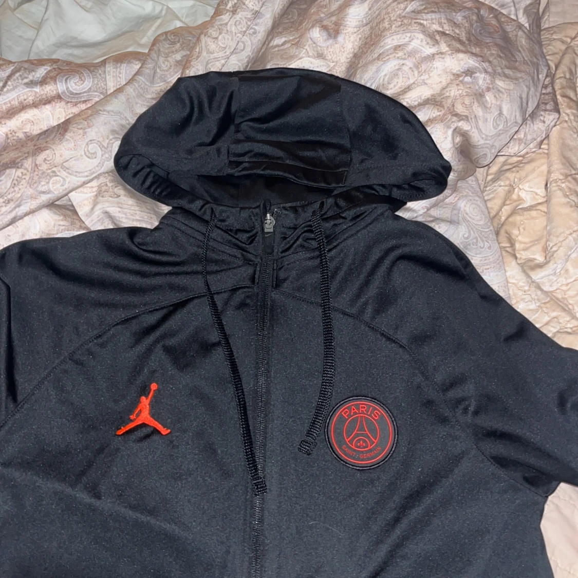 Snygg svart hoodie från Jordan i samarbete med Paris Saint-Germain. Hoodien har en dragkedja framtill och en justerbar huva. Den är dekorerad med det ikoniska Jumpman-logotypen och PSG-emblemet i rött.