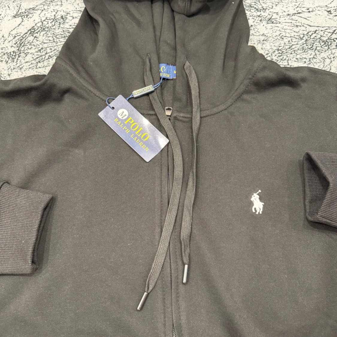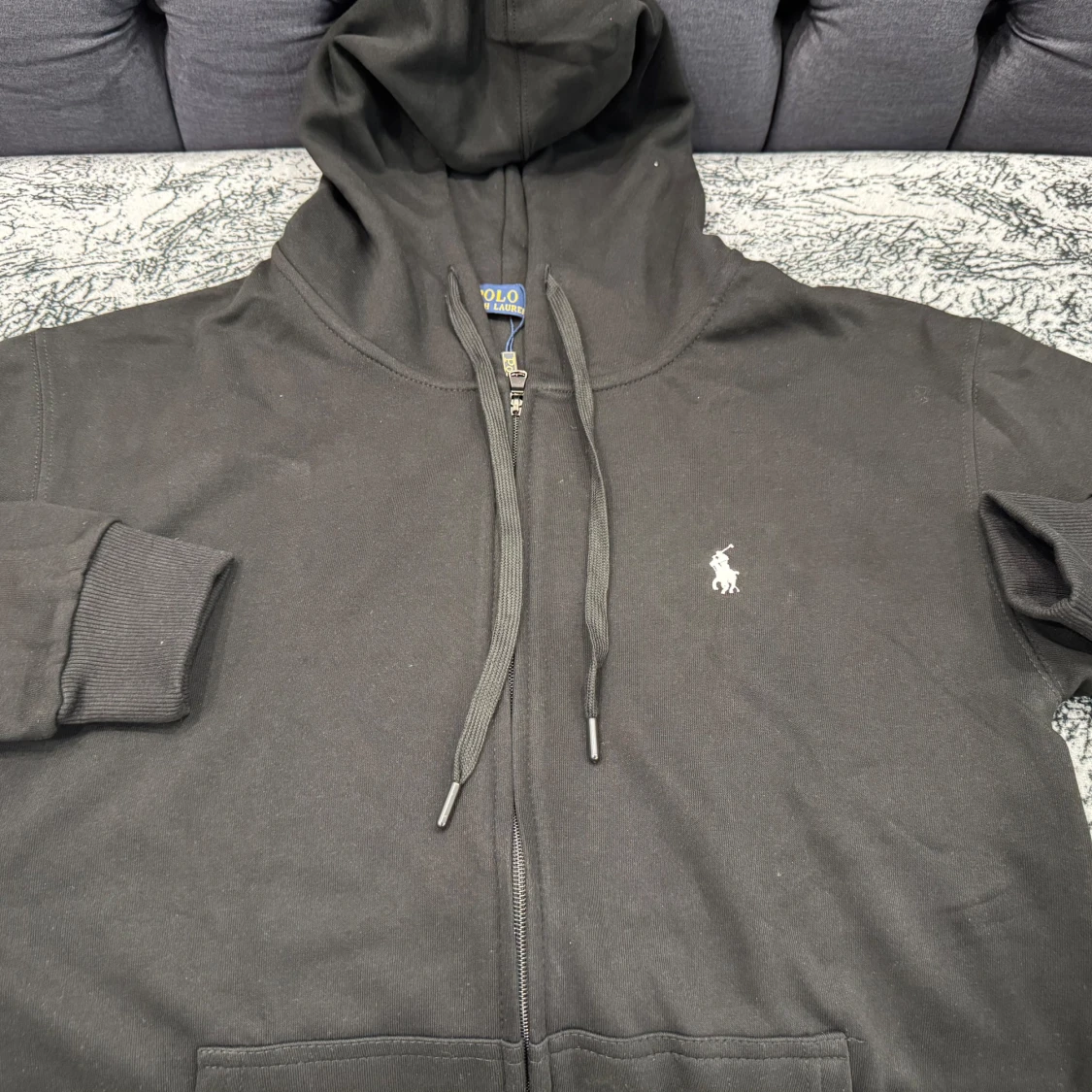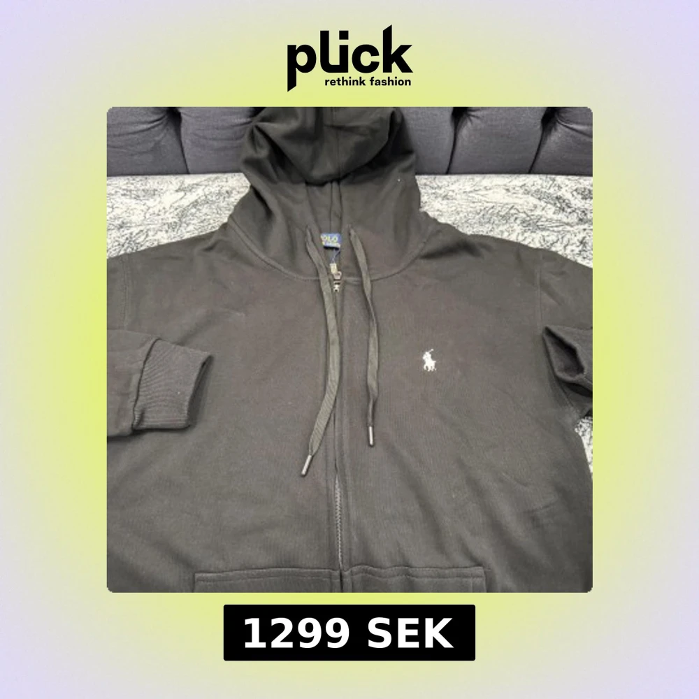 Svart hoodie från Polo Ralph Lauren med dragkedja, huva och snörning. Klassisk logga broderad på bröstet i vitt. Mjukt bomullsmaterial och ribbade muddar vid ärmslut och nederkant. Perfekt för en chill och stilren look.