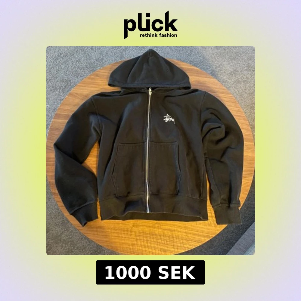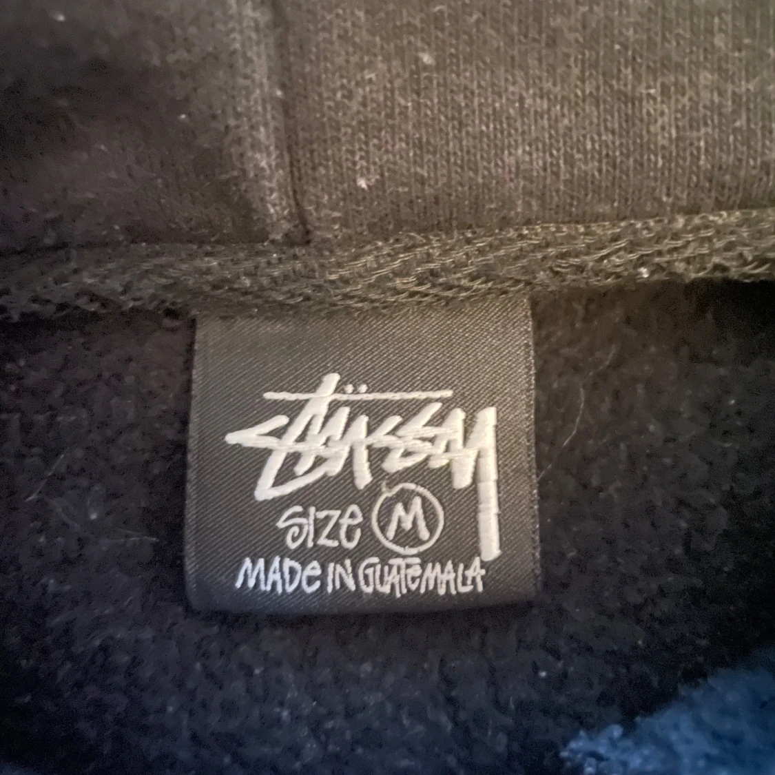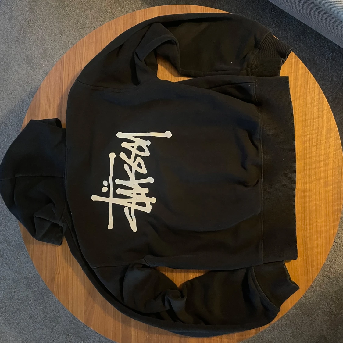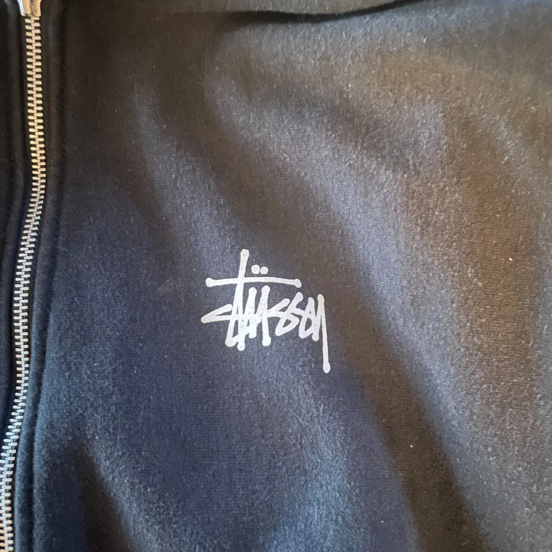 Säljer en svart hoodie från Stussy med dragkedja och stor logga på ryggen. Hoodien har långa ärmar och ribbade muddar vid ärmslut och nederkant. Perfekt för en casual look.