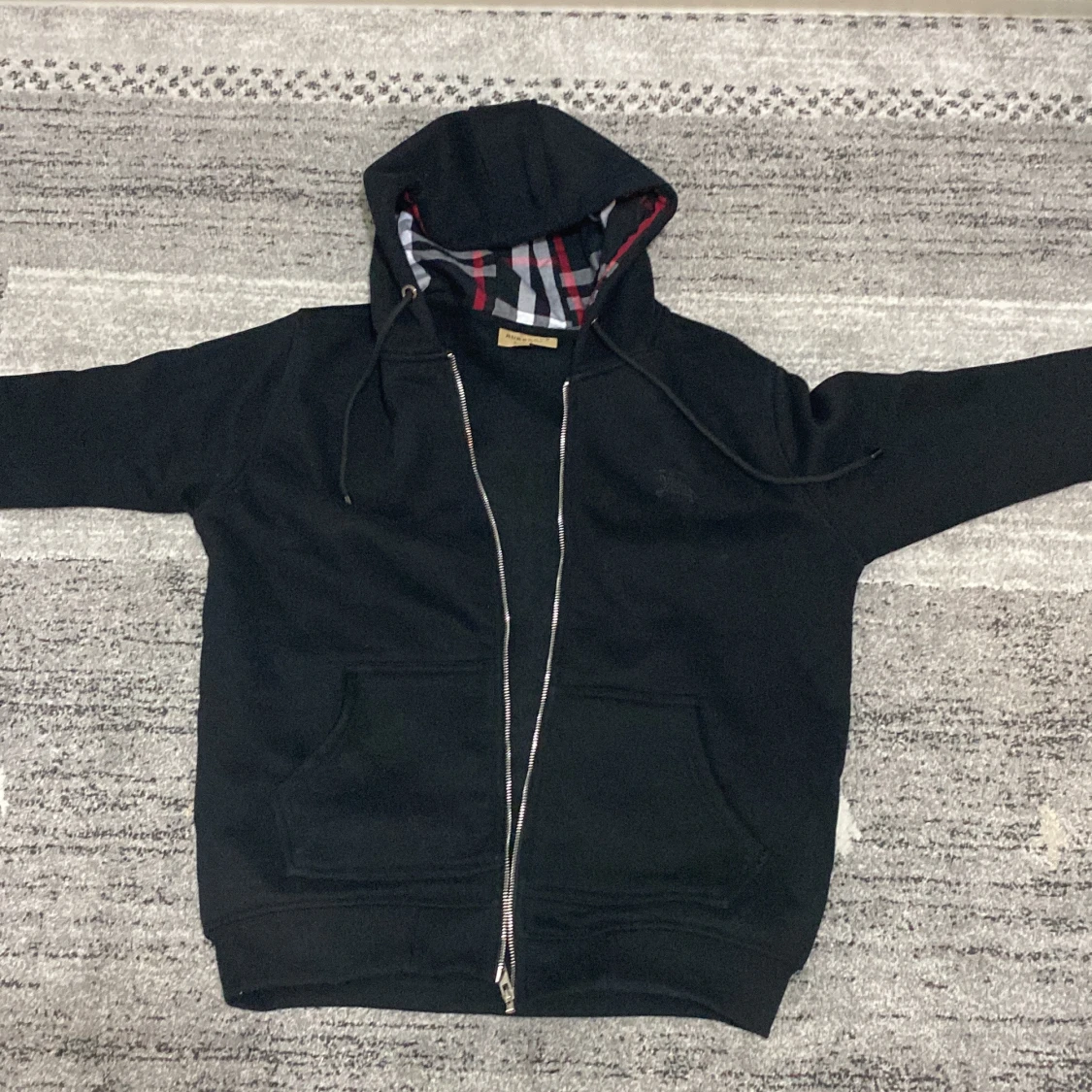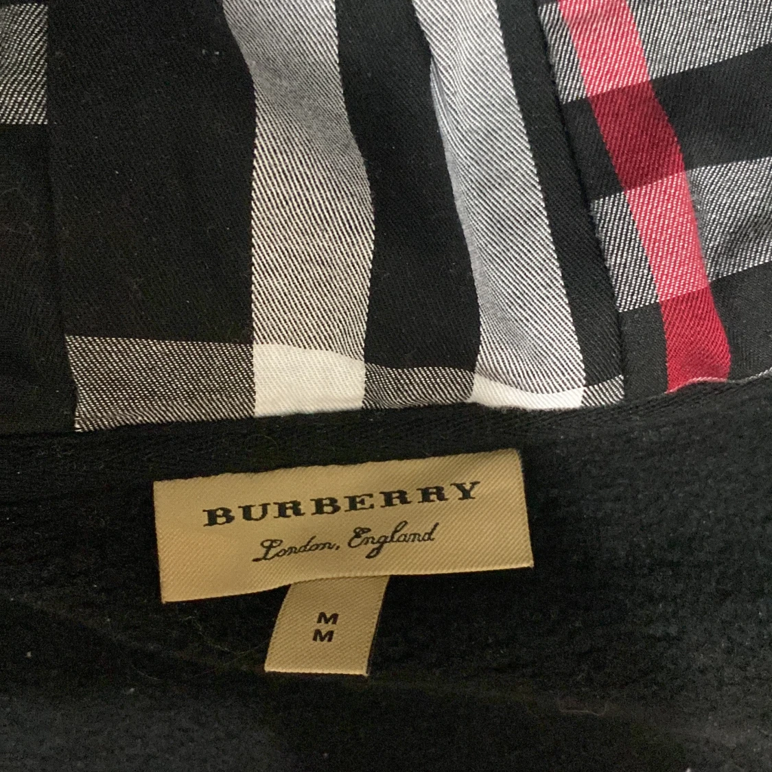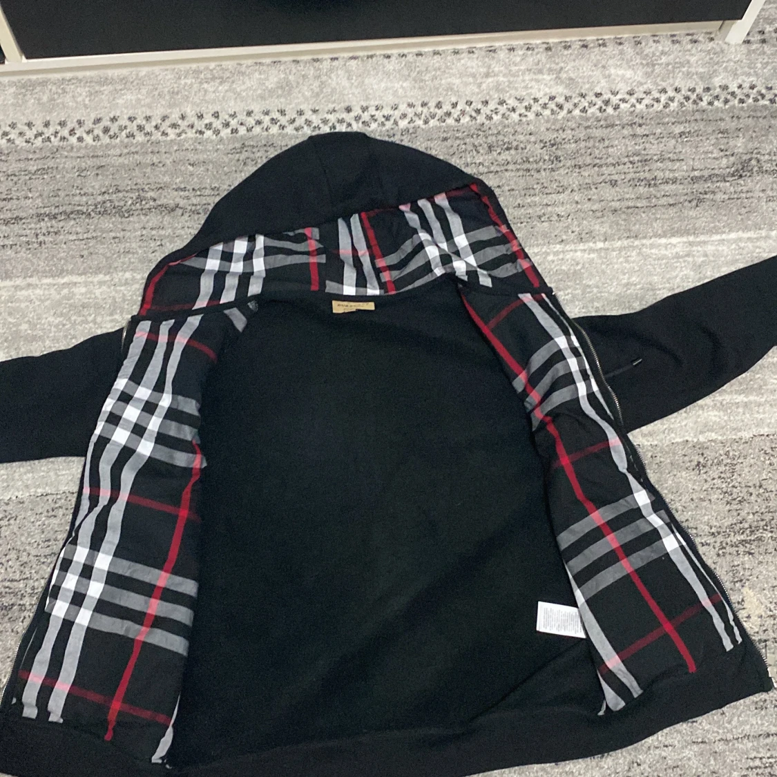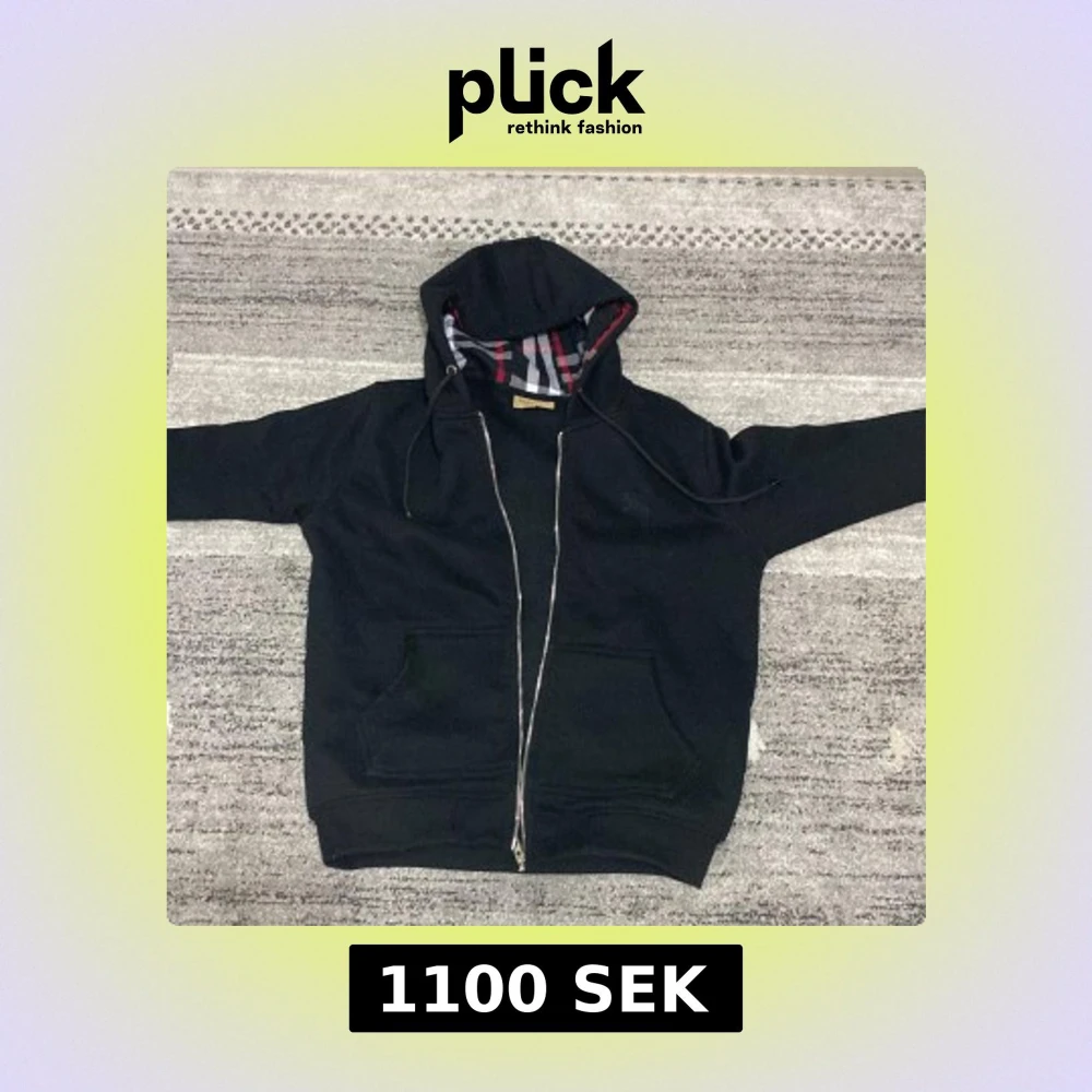 Säljer en stilren svart huvtröja från Burberry med dragkedja och klassiskt rutigt foder i huvan. Tröjan är tillverkad i bomull och har en bekväm passform med långa ärmar och praktiska fickor framtill. Storlek M men funkar för storlek S också priset in diskuteras