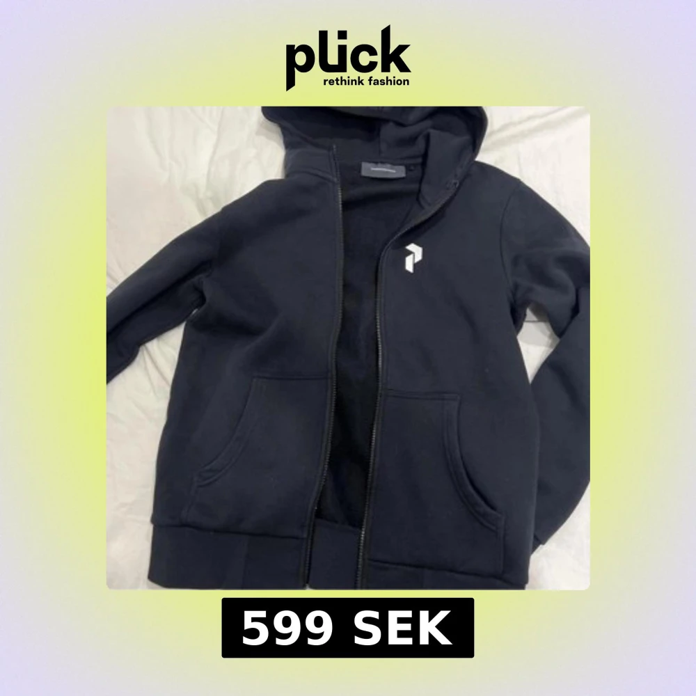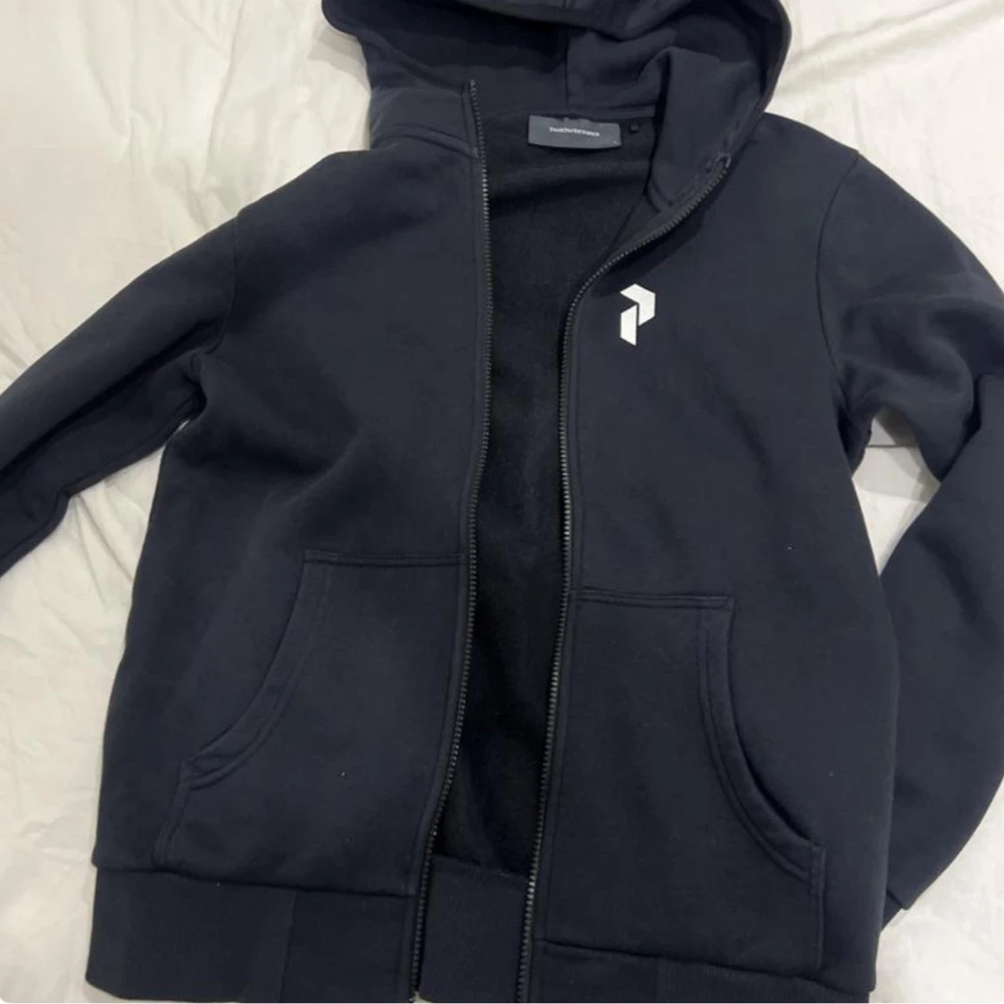 Säljer en svart huvtröja från Peak Performance med dragkedja och en liten logga på bröstet. Tröjan har långa ärmar och en praktisk huva. Perfekt för en avslappnad stil. STORLEK: S