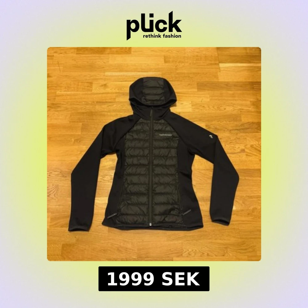 Snygg svart hybridjacka från Peak Performance med huva och dragkedja. Jackan har en quiltad design på framsidan och är tillverkad i syntetmaterial. Perfekt för kyligare dagar.