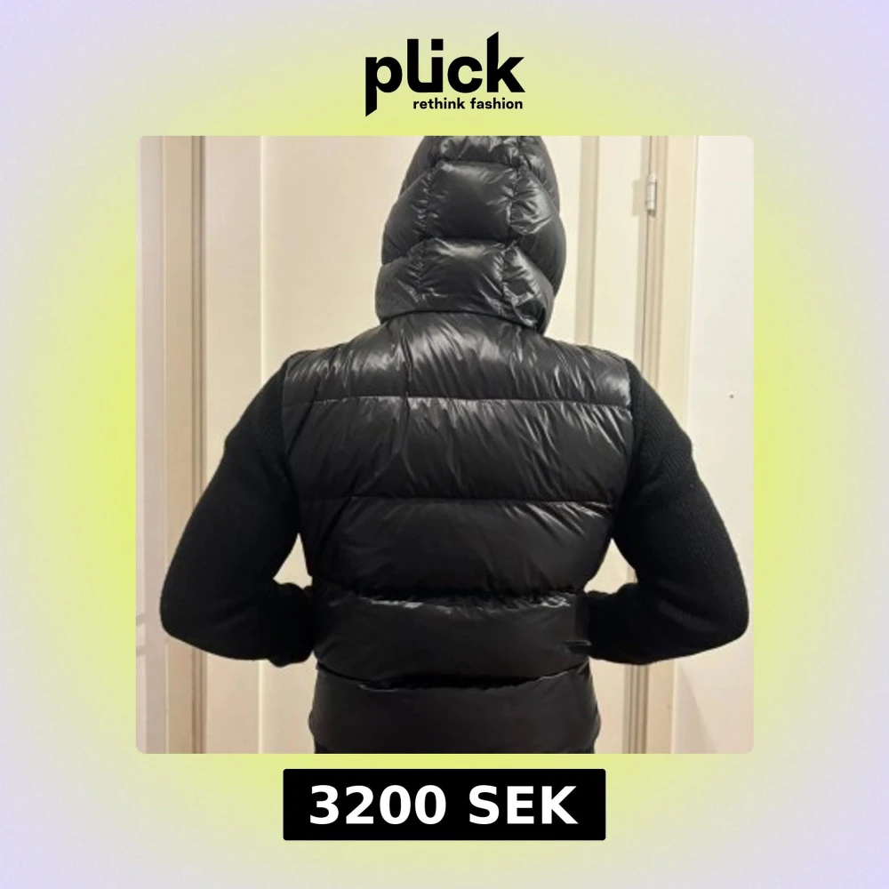 Säljer en svart väst från Moncler med stickade ärmar och quiltad kropp. Västen har dragkedja framtill, två fickor med dragkedja och en vadderad huva. Perfekt för kyliga dagar och har en sportig look. Är 181 så du ser hur de sitter på mig ! Säljs pga den börjar bli för liten !