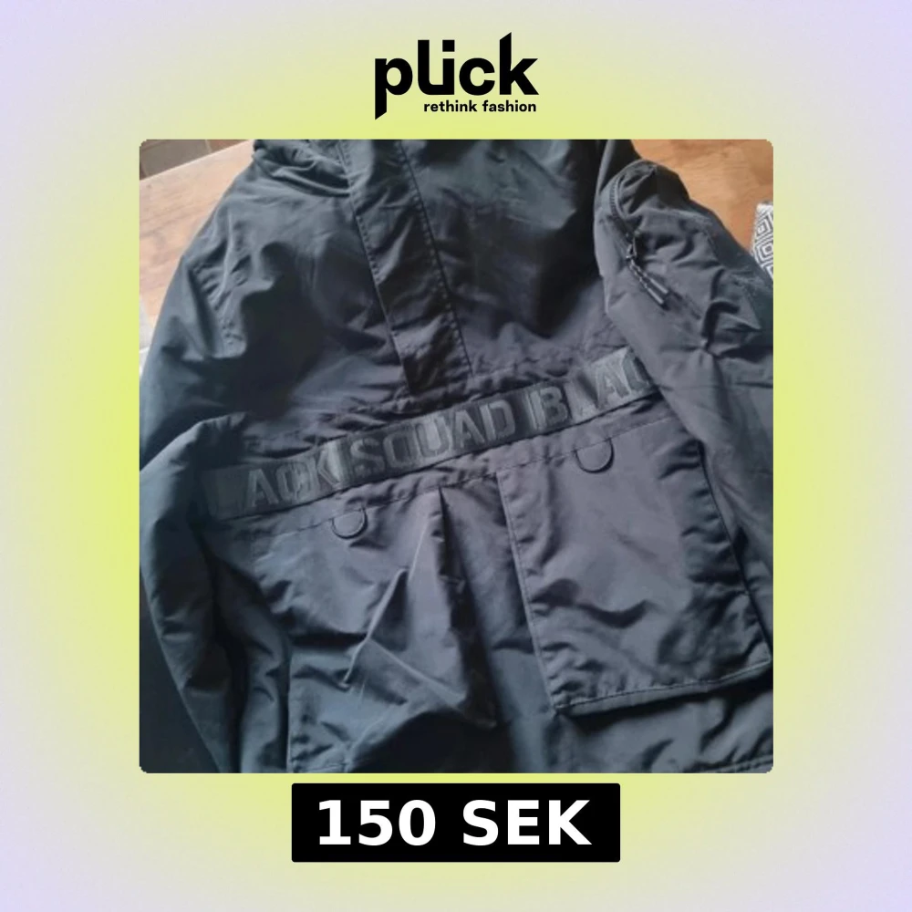 Snygg svart jacka från Black Squad med huva och dragkedja. Jackan har textdetaljer på ärmen och ryggen, vilket ger en cool look. Perfekt för höst- och vinter