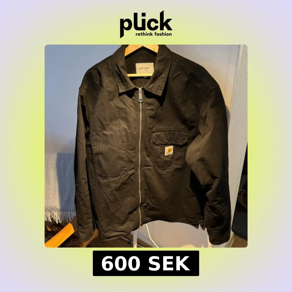 Säljer en svart jacka från Carhartt med dragkedja framtill och en bröstficka med knapp. Jackan har en klassisk krage och är långärmad. Perfekt för en stilren look.