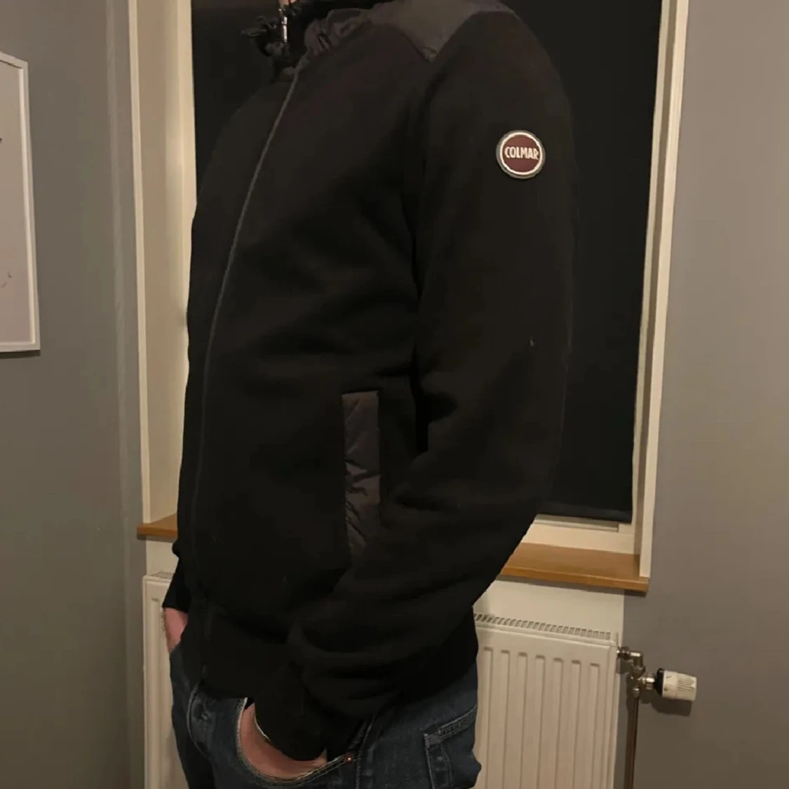 Säljer en svart jacka från Colmar med huva och dragkedja. Jackan har diskret logotyp på ärmen och fickor. Perfekt för dig som vill ha en stilren och enkel jacka med sportig känsla.