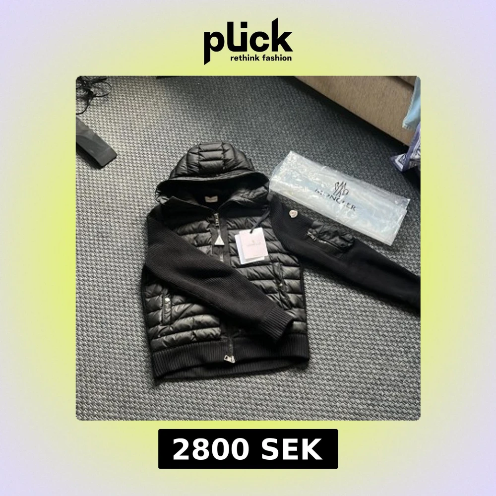 Säljer en snygg svart jacka från Moncler med quiltad design och huva. Jackan har långa ärmar och dragkedja framtill. Perfekt för kyligare dagar.