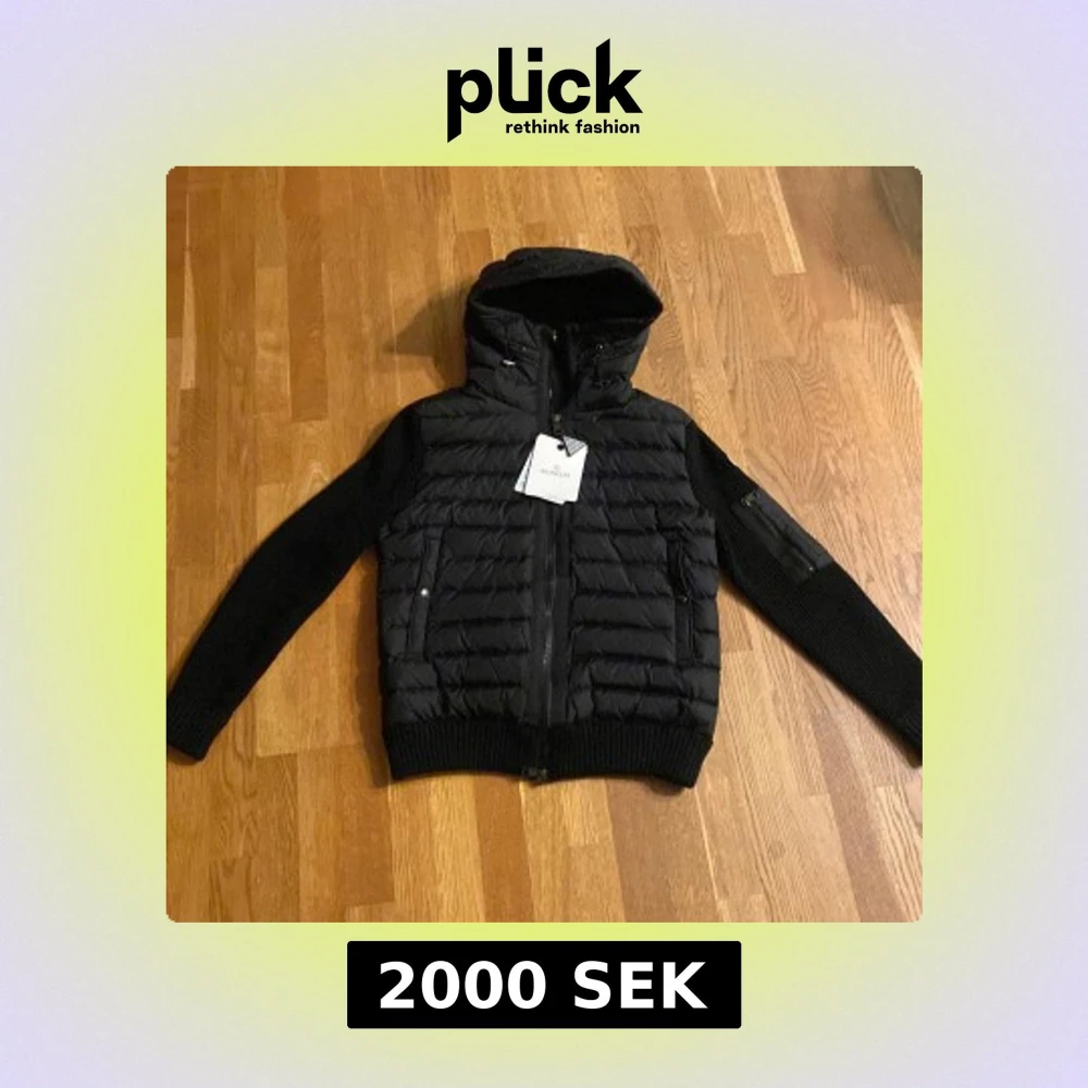 Snygg svart jacka från Moncler med quiltad design och stickade ärmar. Jackan har en dragkedja framtill och en huva för extra skydd. Perfekt för kyligare dagar.
